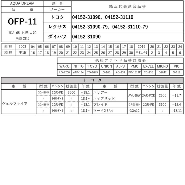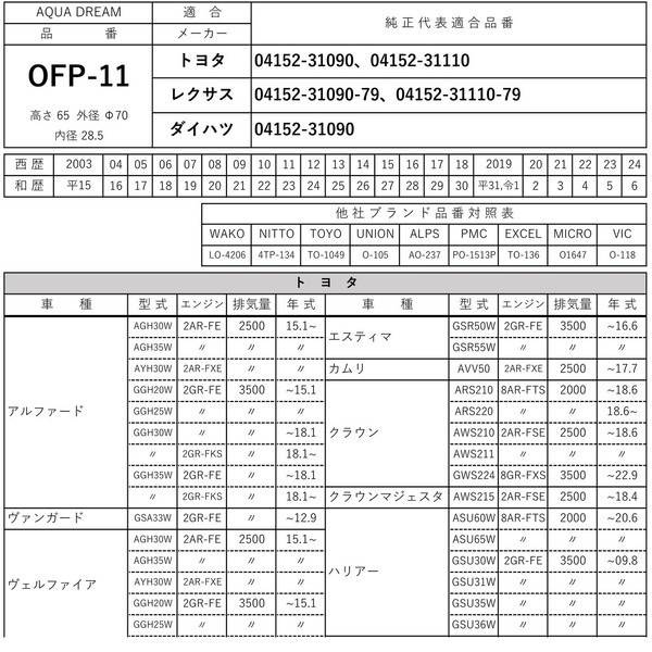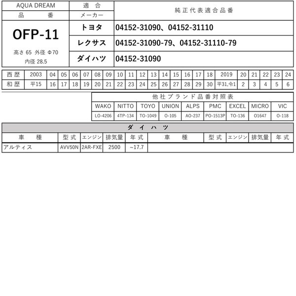 ■互換品番:「WAKO」LO-4206 ・ 「NITTO」4TP-134 ・ 「TOYO」TO-1049 ・ 「UNION」O-105 ・ 「ALPS」AO-237 ・ 「PMC」PO-1513P ・ 「EXCEL」TO-136 ・ 「MICRO」O1647