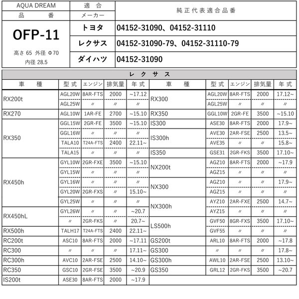 | 商品名 | PLATINUM オイルフィルター トヨタ・ダイハツ車用 (純正品番:04152-31090等) AD-OFP-11 |