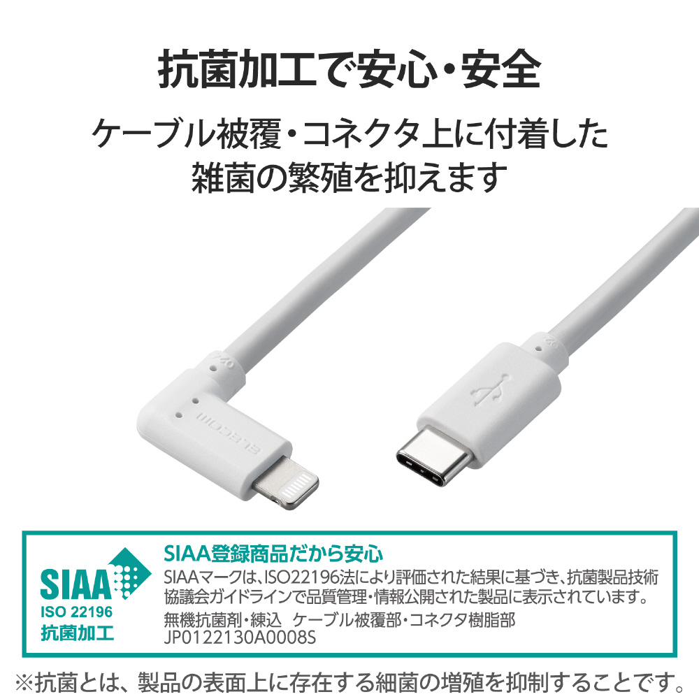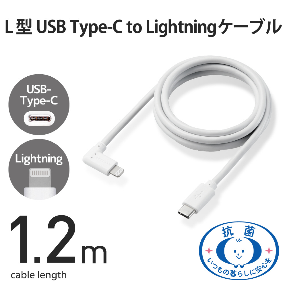 iPhone 充電ケーブル Type-C ライトニングケーブル 1.2m PD 対応 L字 MFi認証 超急速 抗菌 【 Lightning コネクター搭載 iPhone iPad iPod AirPods 対応 】 タイプC ホワイト MPA-CLL12WH