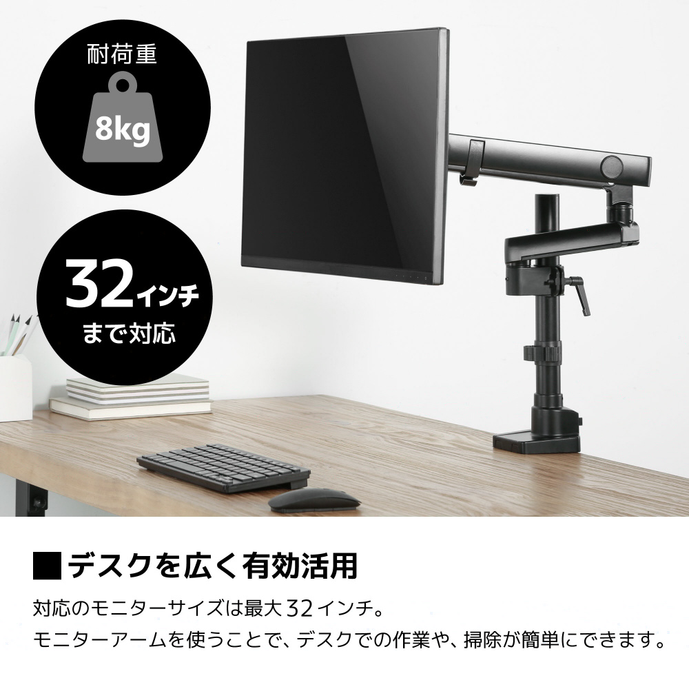 モニターアームを使って、モニター脚部のデスクスペースを有効活用。デスクでの作業や、掃除が簡単にできます。