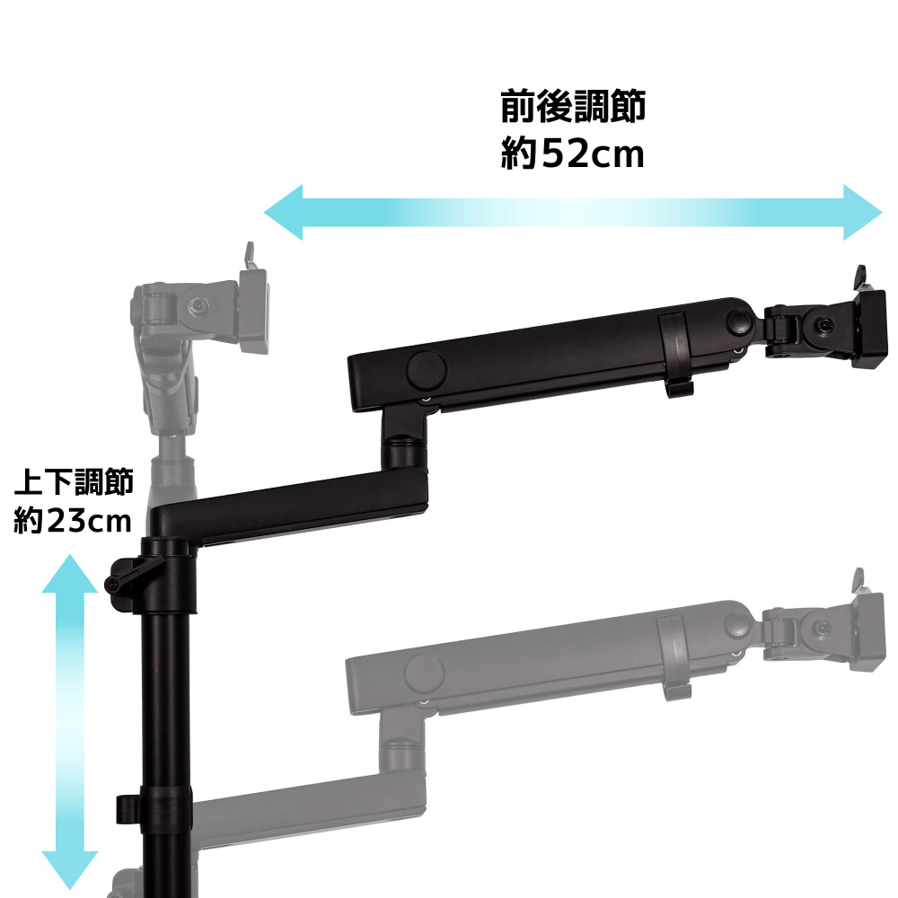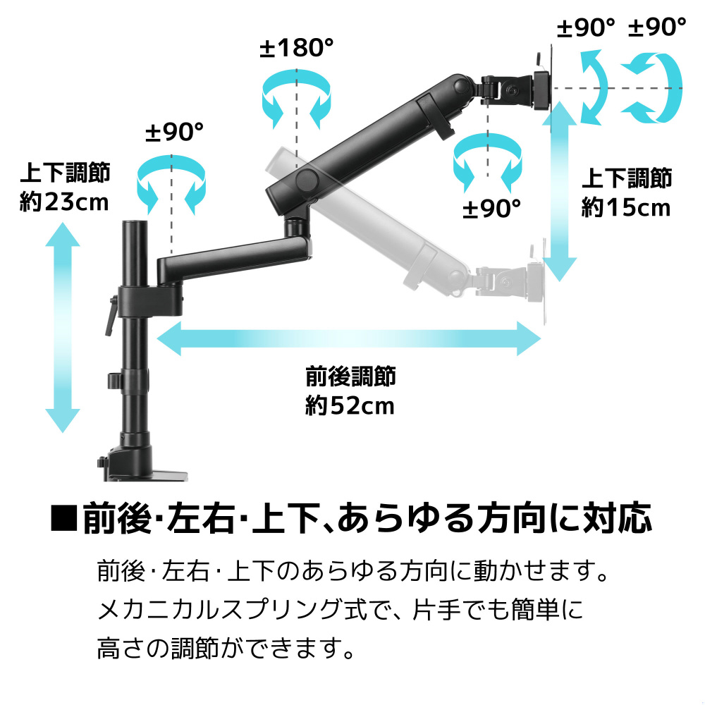 メカニカルスプリング式なので、片手で簡単に高さの調節できます。前後・左右・上下の移動ができます。