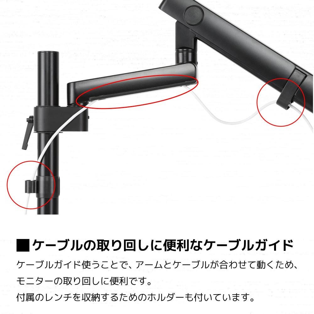 ケーブルガイドにケーブルを通すことで、アームとケーブルが合わせて動き、モニターの取り回しに便利です。