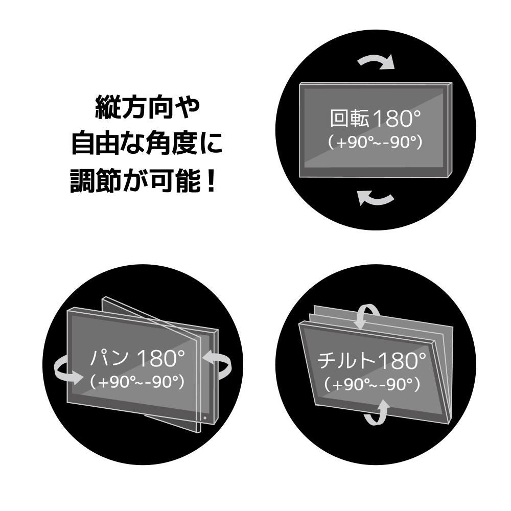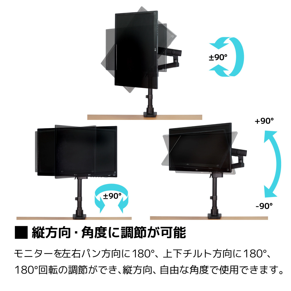 取付けたモニターを180度回転できるので、縦方向など、好きな位置にして使用できます。