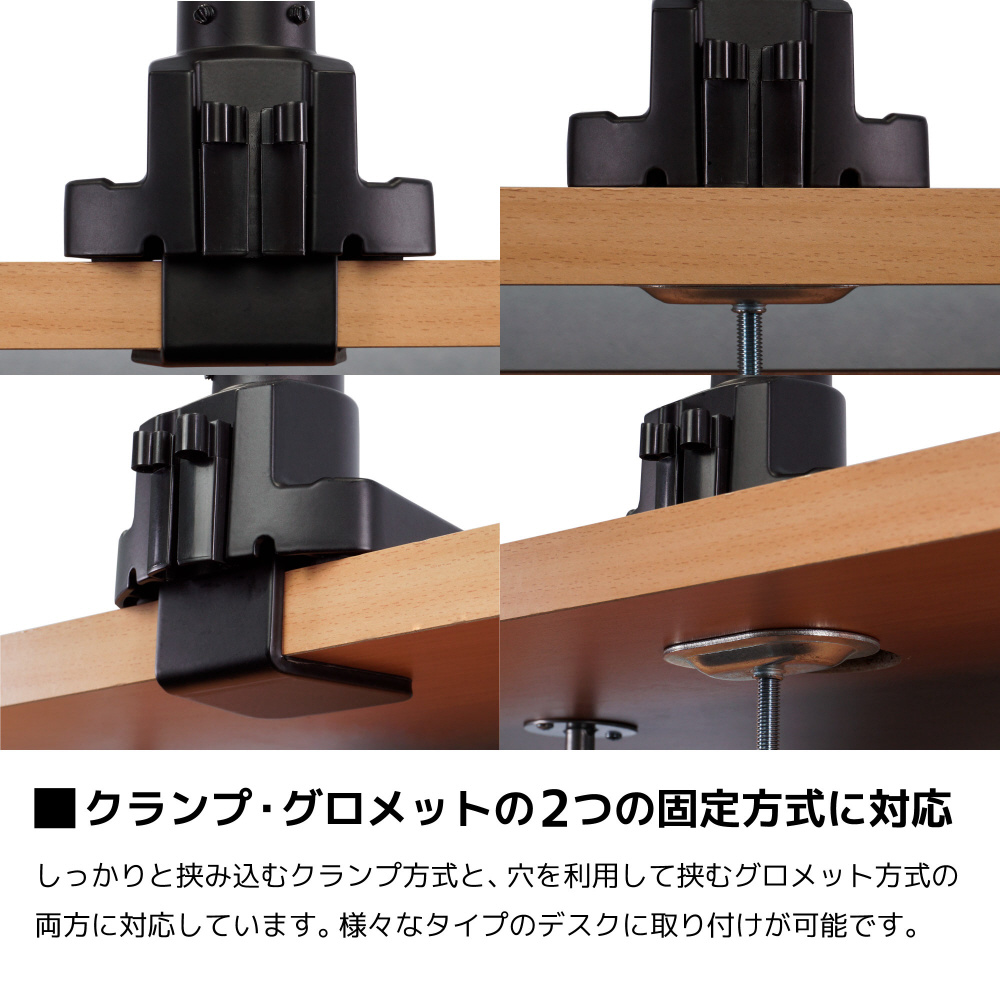 しっかりと挟み込むクランプ方式と、穴を利用してしっかりと挟むグロメット方式の、2つの固定方式に対応しています。様々なタイプのデスクに取り付けが可能です。