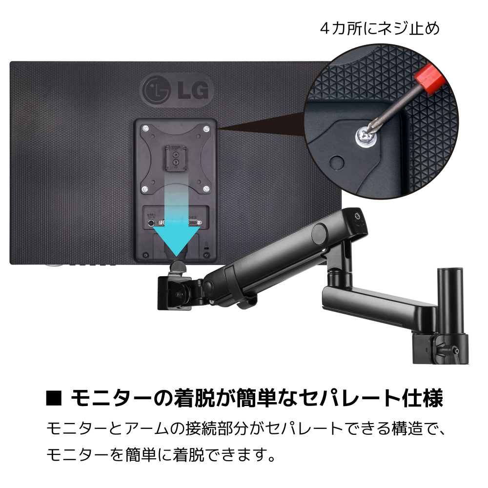 モニターにVESAパーツ取り付け後の、モニターとアームの着脱は、ストッパーを押して持ちあげるだけで、スクリューレスで取り外せます。