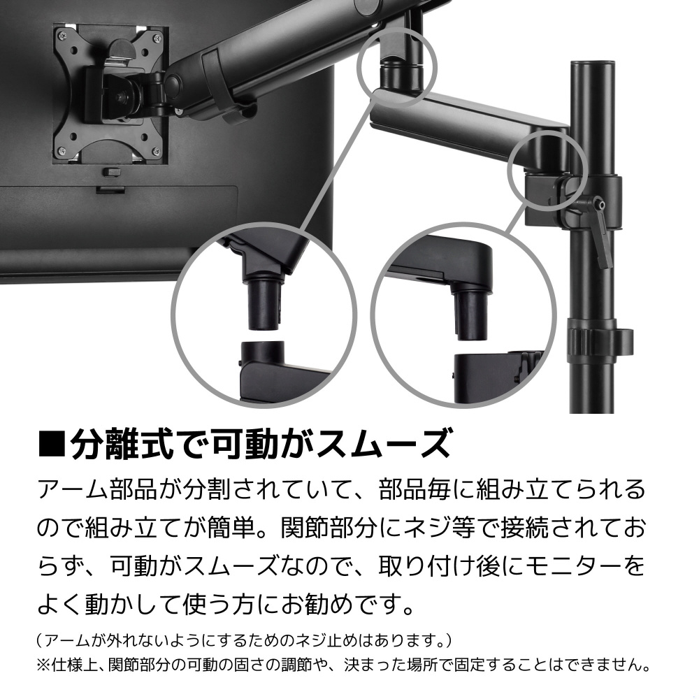 関節部分にネジ等で接続されておらず、可動がスムーズなので、取り付け後にモニターをよく動かして使う方にお勧めです。(アームが外れないようにするためのネジ止めはあります。)