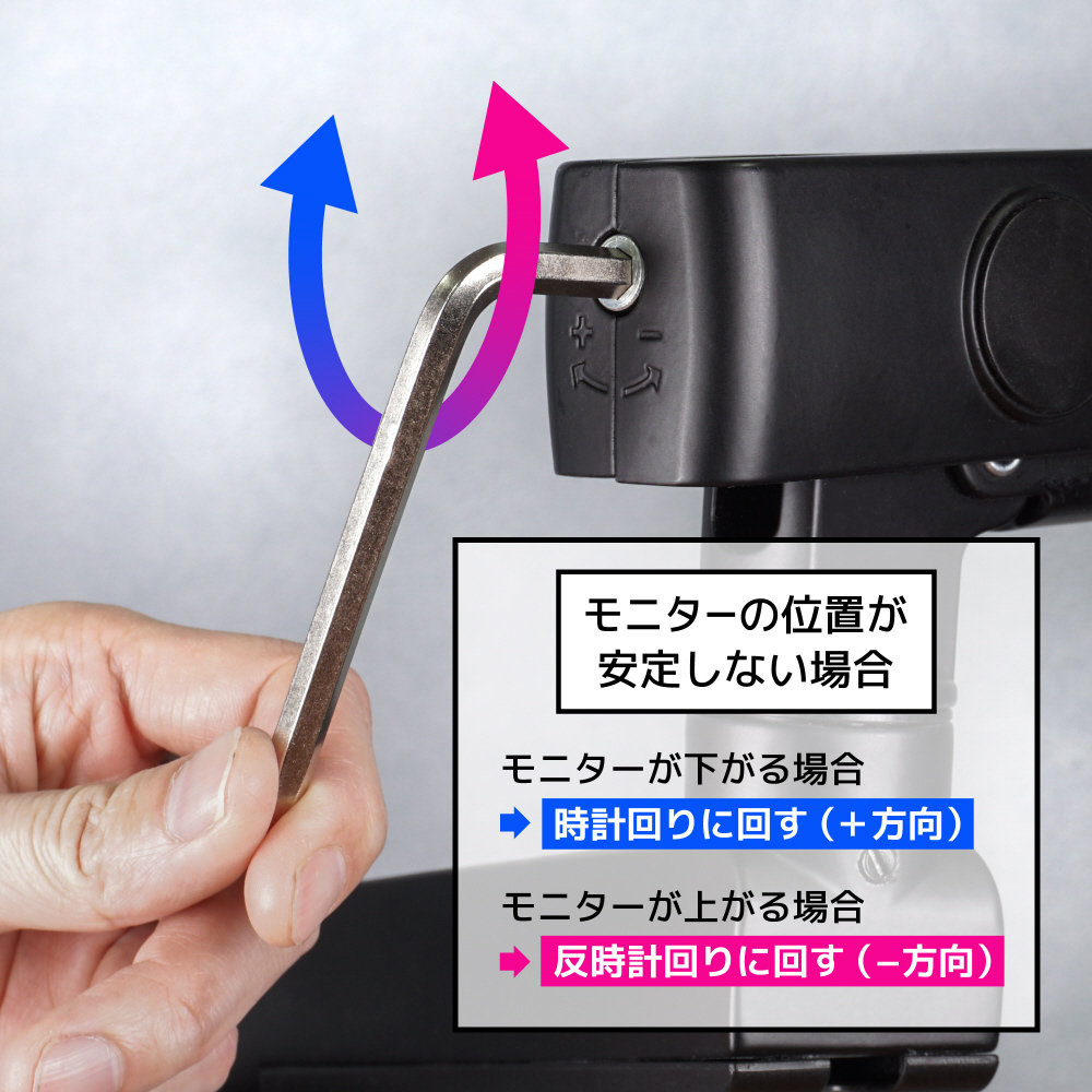 モニターの位置が下がる、などの場合は、付属の六角レンチで本製品のスプリングを調節してください。