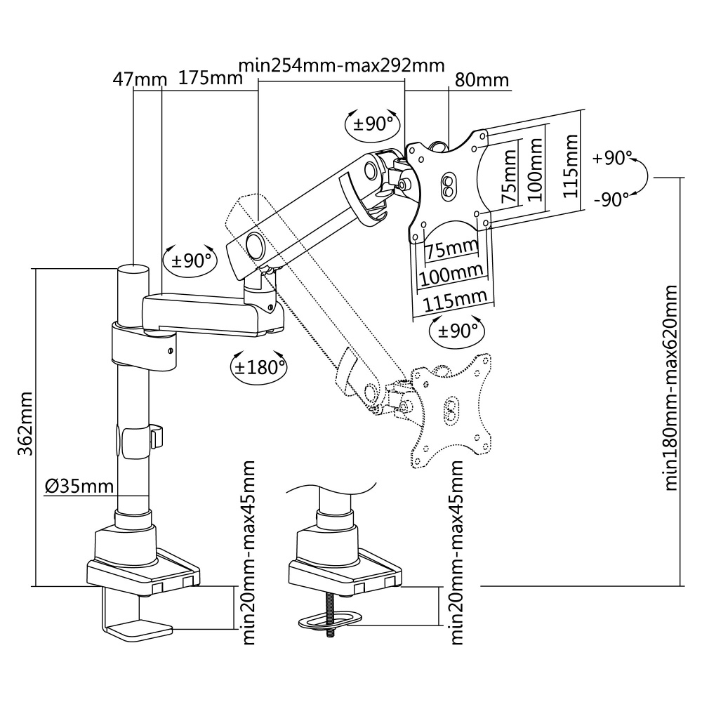 | 仕様2 | 耐荷重:最大8kgまで 取付方式:クランプ方式 / グロメット方式 取付可能天板:クランプ:20〜45mm / グロメット:20〜45mm 取付必須スペース:幅 105mm / 奥行 110mm 可動範囲: 回転 180°(+90° / -90°) パン(左右) 180°(+90° / -90°) チルト(上下) 180°(+90° / -90°) |