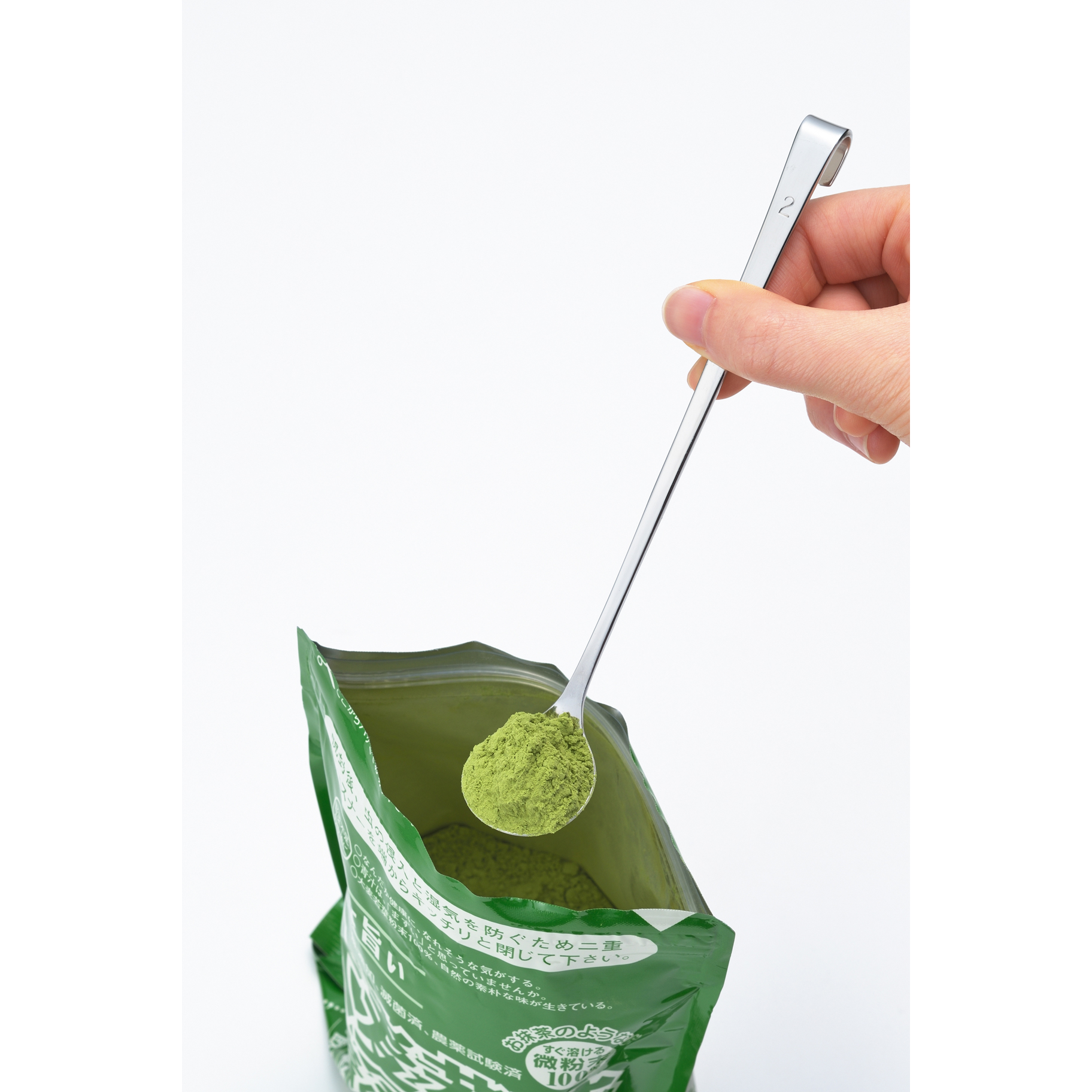 フック形状の持ち手で粉末がこぼれにくい設計です。