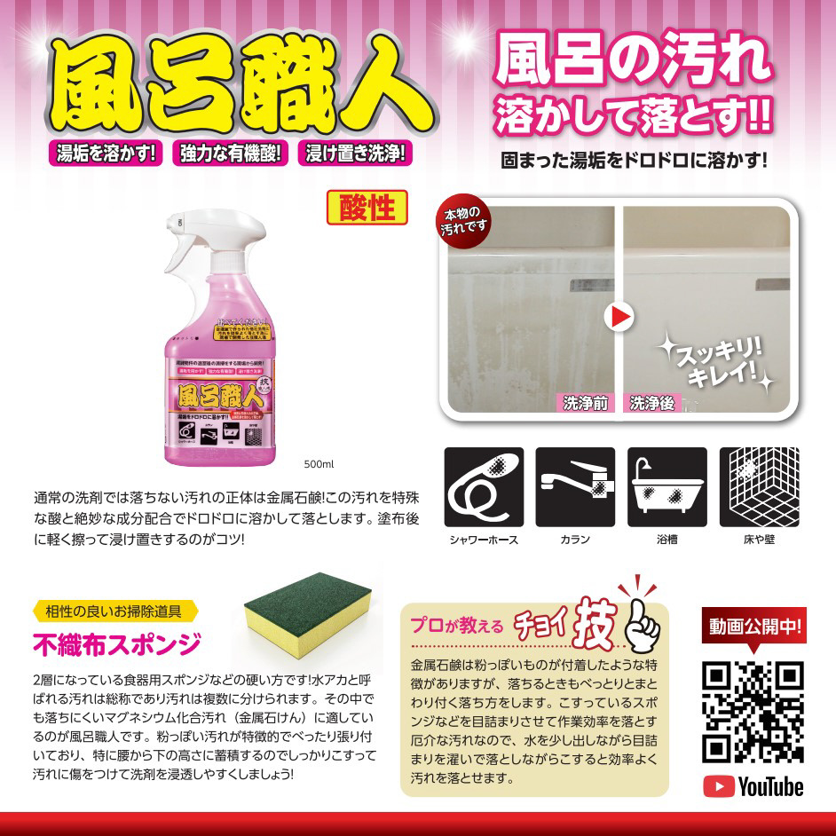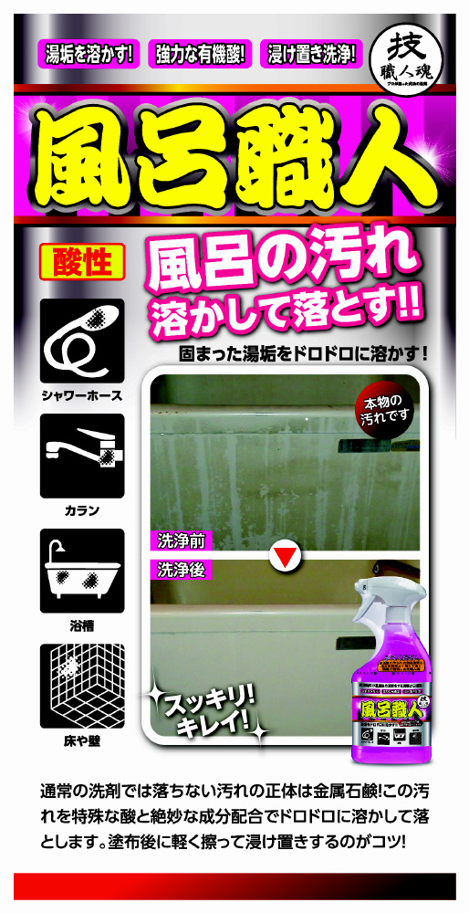 ◯風呂職人は・・・湯アカをドロドロに溶かす事により「擦る、削る」などの作業を大幅に短縮し、手間を省きます。
