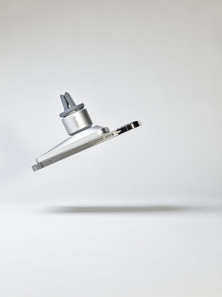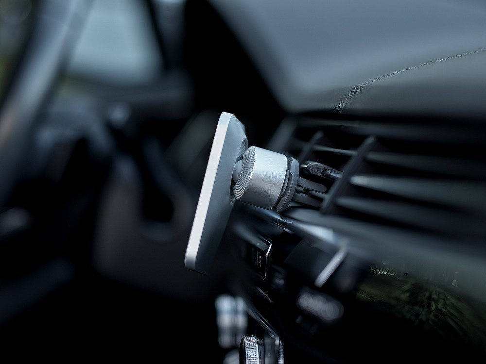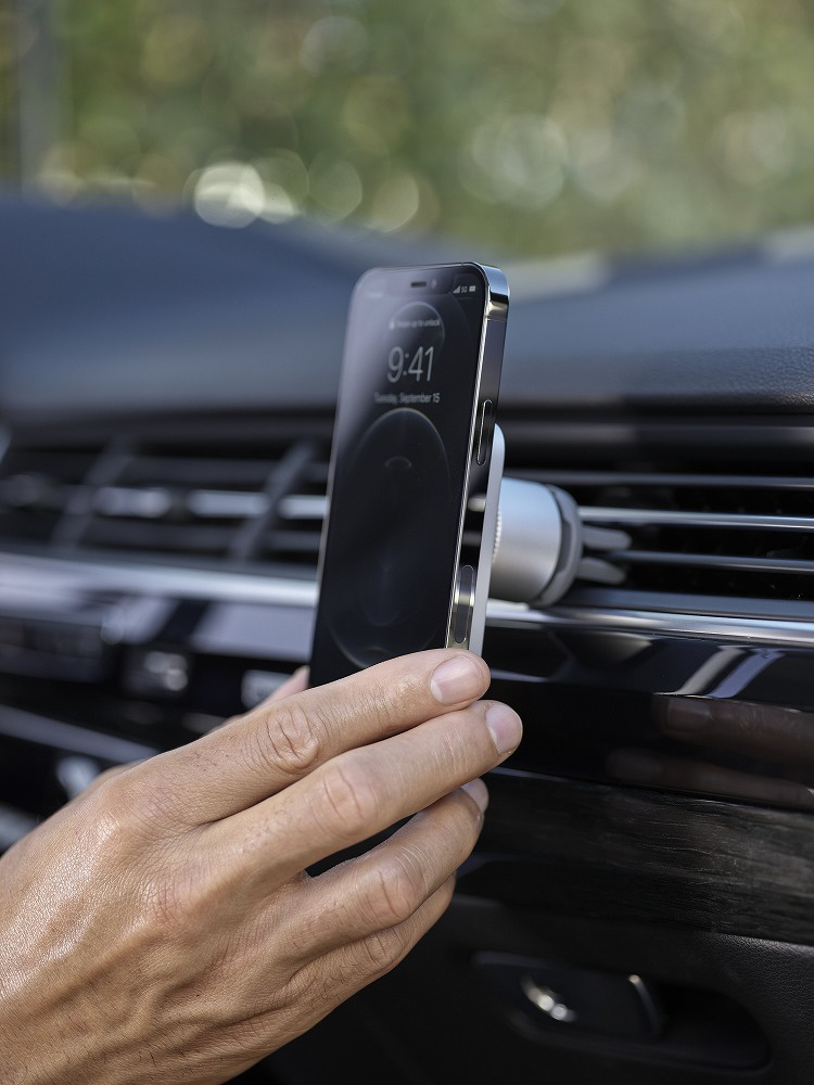 MagSafeに対応した車載用iPhone Stand。強力な磁力により、エアコン吹き出し口に安全にiPhoneを設置いただけます。