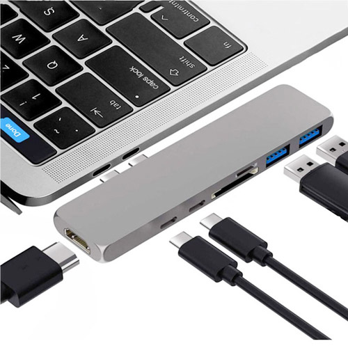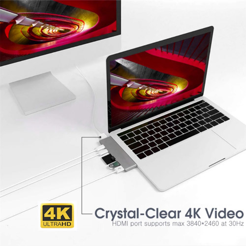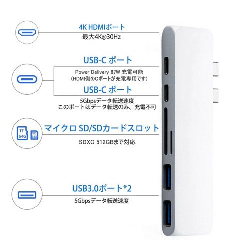 Macbook用 7 in 1 マルチドッキングアダプター 本体一体型 7 in 1 ハブ / HDMI 4K出力 / 高速USB 3.0x2 / 87W 本体充電 / Type-Cポートx2 / SDXC 512GB対応 SD&MicroSD