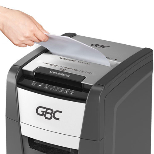 一度にA4コピー用紙300枚を重ねてセットするだけで自動細断できるオートフィードシュレッダ。 カバーを開けて紙をセットするだけで細断。