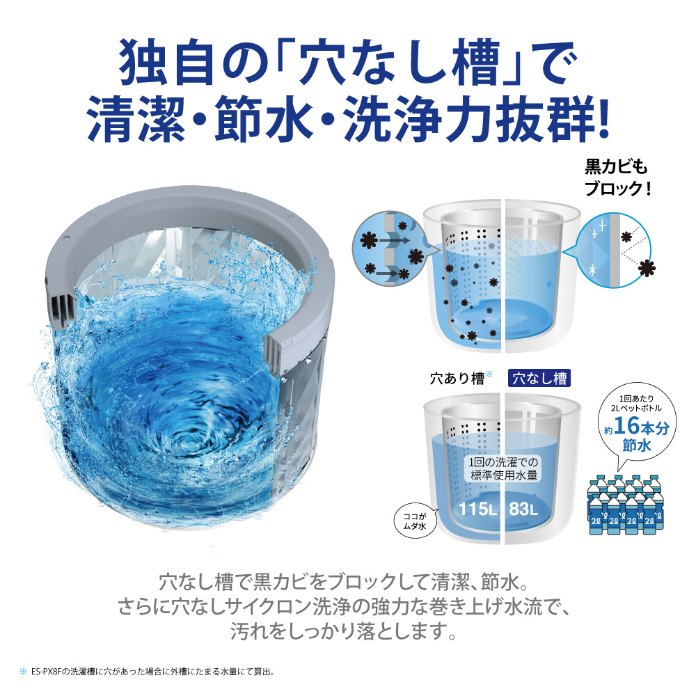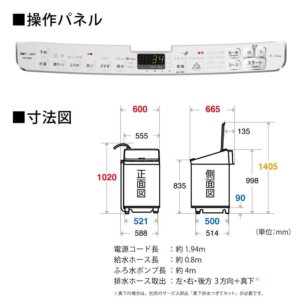 | 商品名 | 縦型乾燥洗濯機 ホワイト系 ES-PX8F-W [洗濯8.0kg /乾燥4.5kg /ヒーター乾燥 /上開き] |