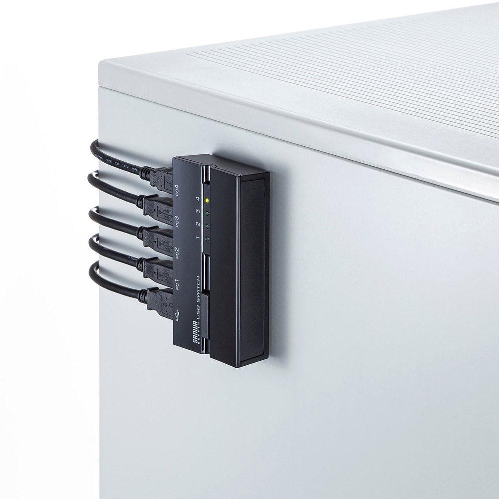 4台のパソコンで1台のUSB2.0機器を切替えて共有でき、強力マグネットでスチール面にしっかり固定できるUSB2.0切替器。