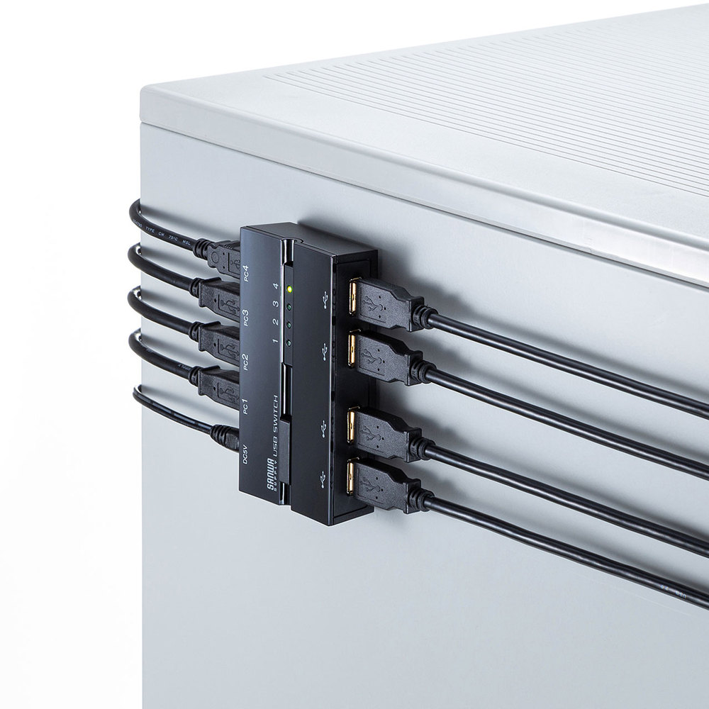 4台のパソコンで4台のUSB2.0機器を一括切替えで共有でき、強力マグネットでスチール面にしっかり固定できるUSB2.0ハブ付き切替器。