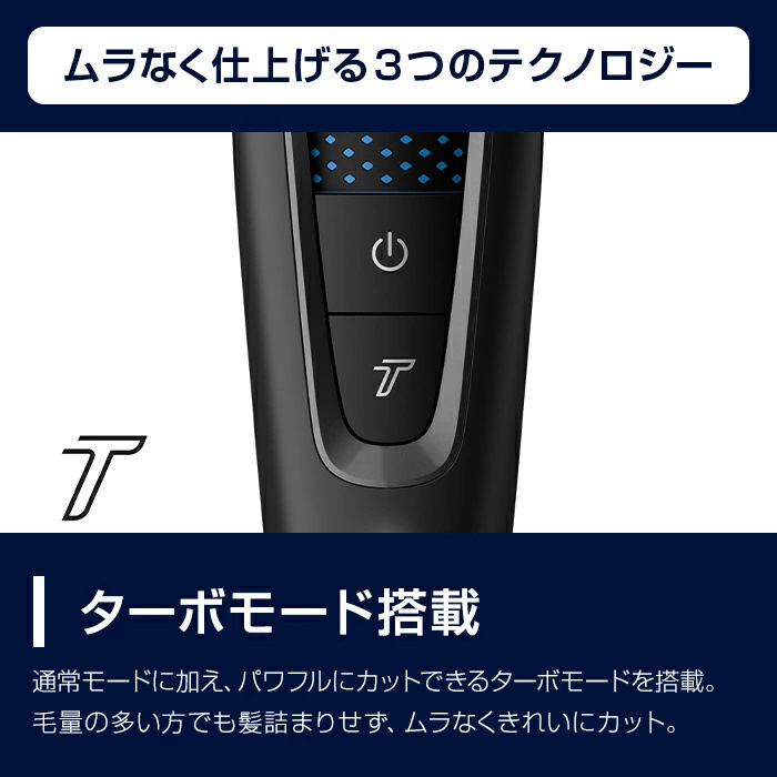 通常モードに加え、パワフルにカットできるターボモードを搭載。毛量の多い方でも髪詰まりせず、ムラなくカットできます。