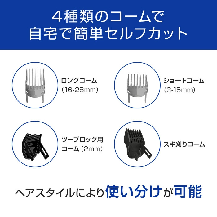 | 付属品 | 取扱説明書、グローバル保証書、充電アダプタ、ツーブロック用コーム(2o)、ショートコーム(3−15o)、ロングコーム(16−28o)、スキ刈りコーム、クリーニングブラシ、ポーチ |
