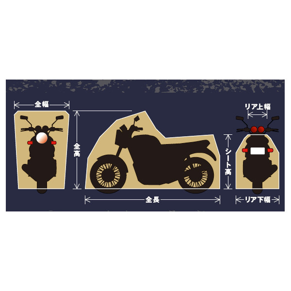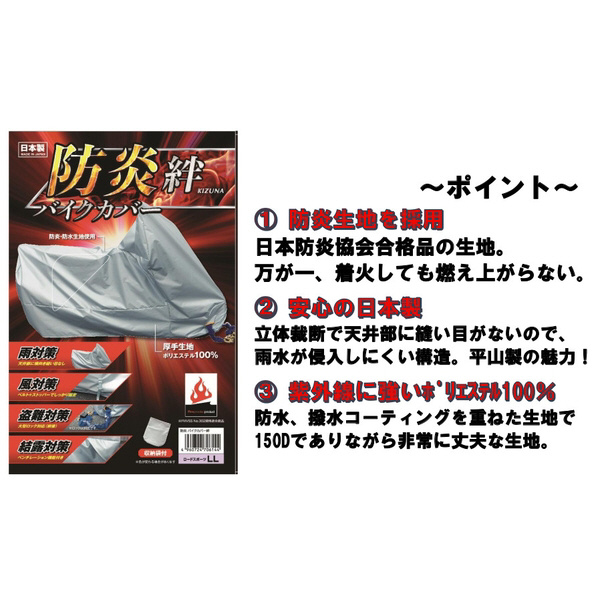 | 商品名 | 防炎バイクカバー絆-フル装備 防炎バイクカバー 絆(厚手生地:ポリエステル100%) フル装備サイズ(収納袋付き) 6182 |