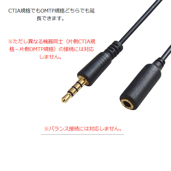 CTIA規格、OMTP規格どちらでも延長できます。※ただし異なる規格同士の接続には対応しません。※バランスの接続には対応しません。