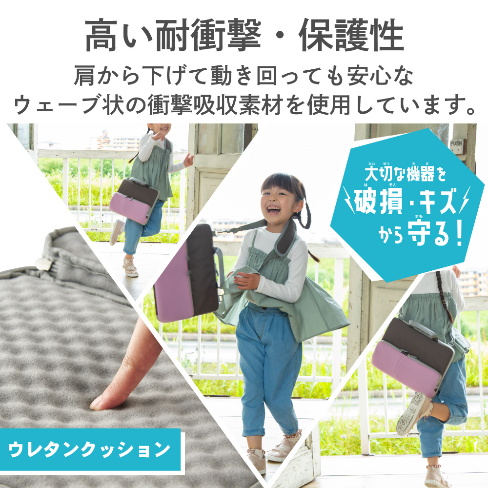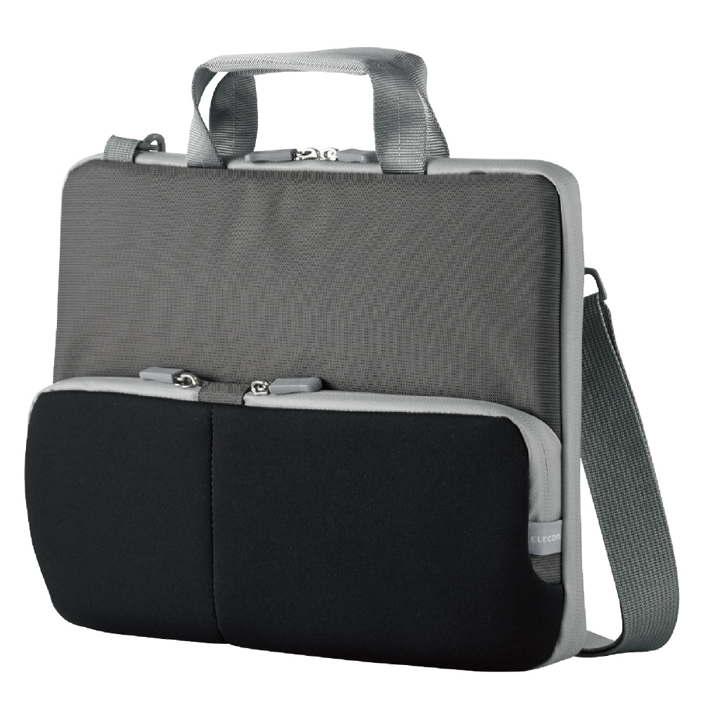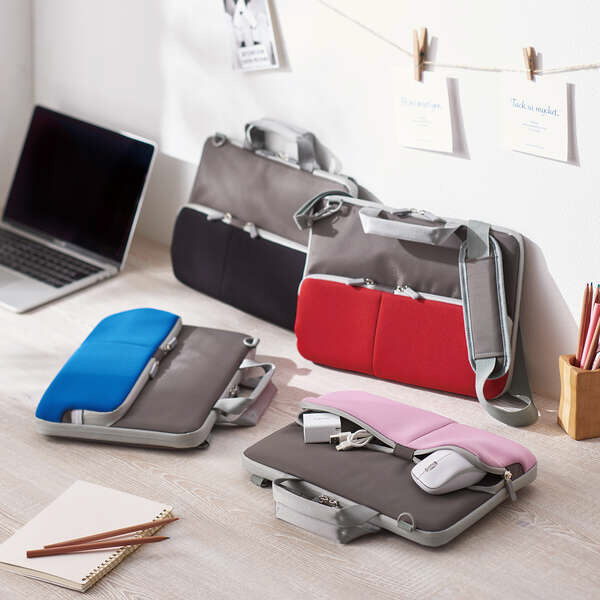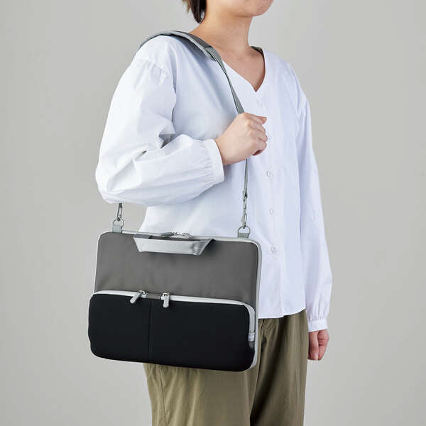 肩掛けによって運搬時に両手を空けられる!低反発ポリウレタンを内蔵したメイン気室と伸縮素材を採用したフレキシブルポケットによって、パソコン本体と周辺機器を安心して持ち運べる、ショルダーベルト付き耐衝撃ポケットインナーバッグ。