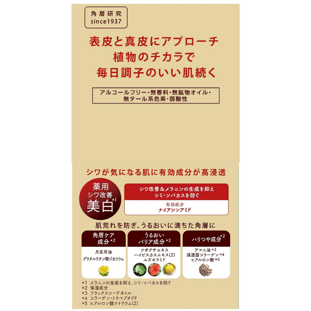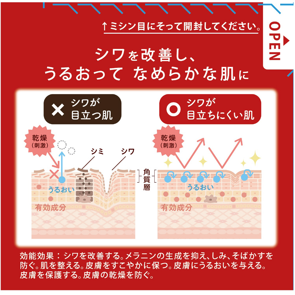 シワを改善する。メラニンの生成を抑え、しみ、そばかすを防ぐ。肌を整える。皮膚をすこやかに保つ。皮膚にうるおいを与える。皮膚を保護する。皮膚の乾燥を防ぐ。