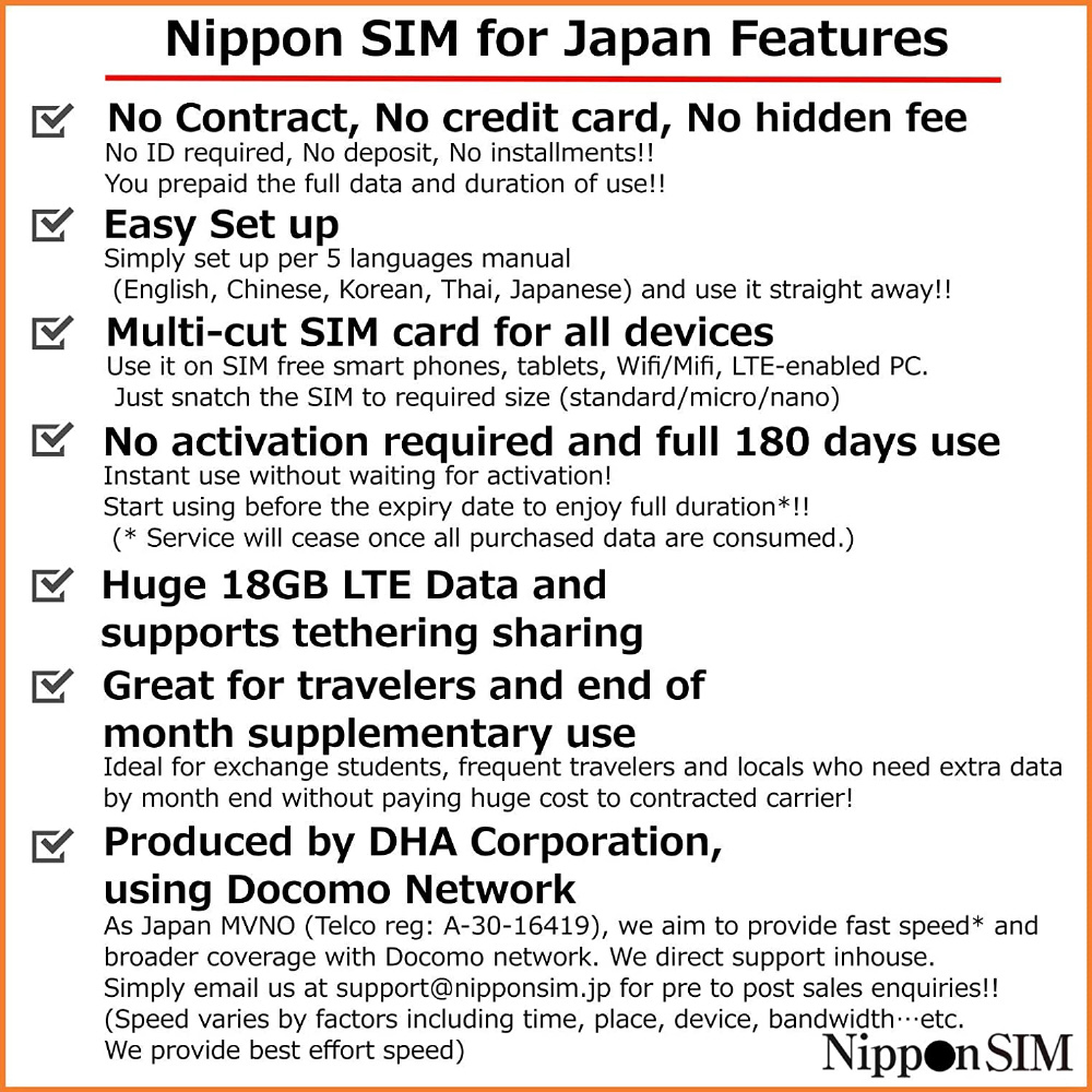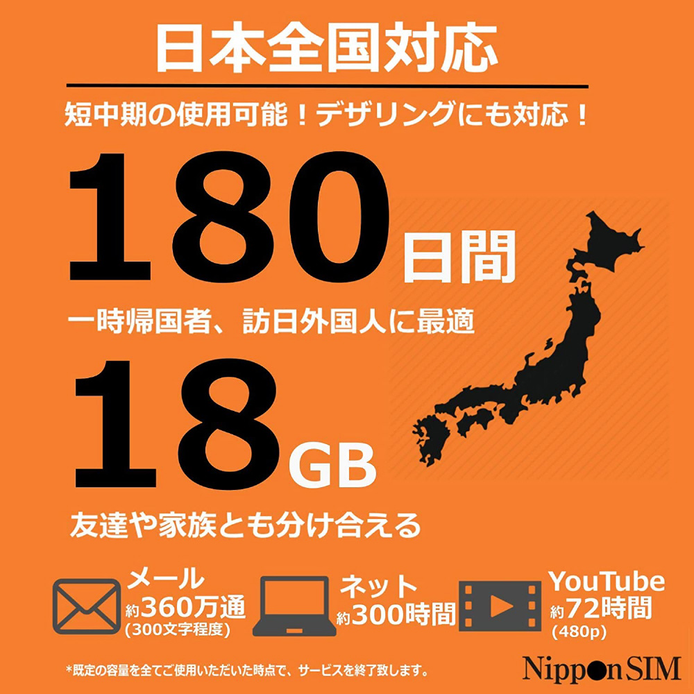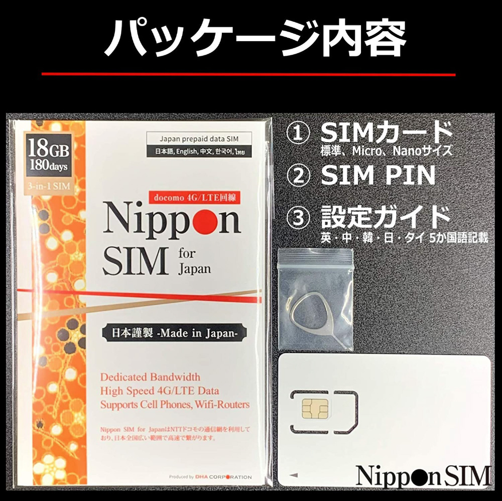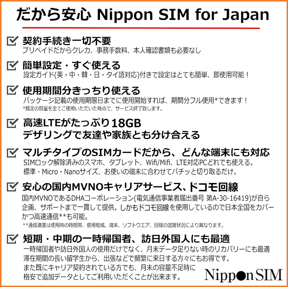 Nippon SIM for Japan 標準版 180日18GB 日本国内用プリペイドデータSIMカード DHASIM100 [マルチSIM] 【864】