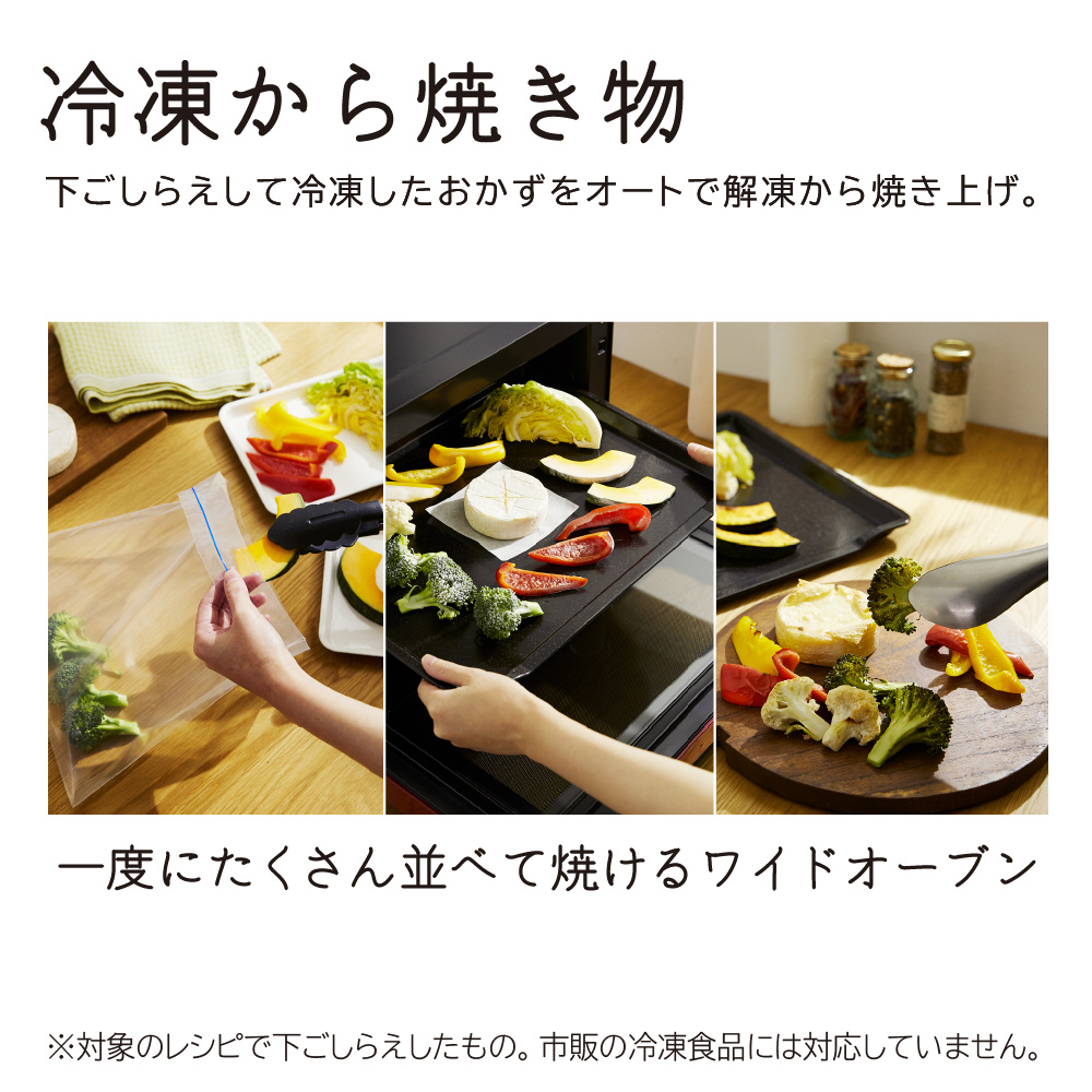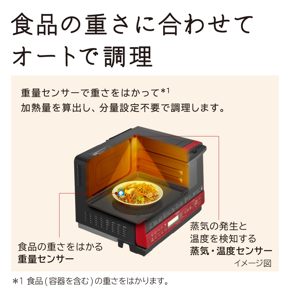 食品の重さにあわせてオート調理「重量センサー」。オーブン調理にも「外して丸洗いテーブルプレート」。一度にたくさん焼ける「250℃1段ワイドオーブン」。