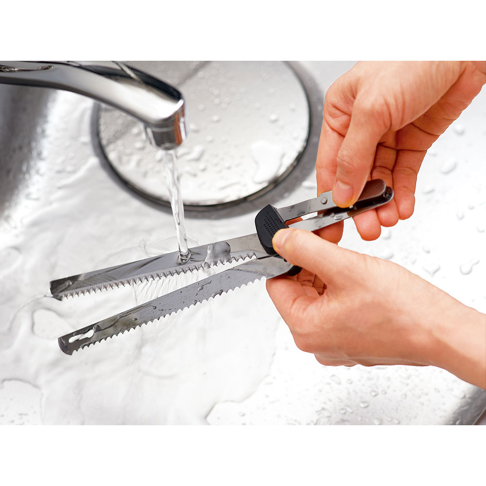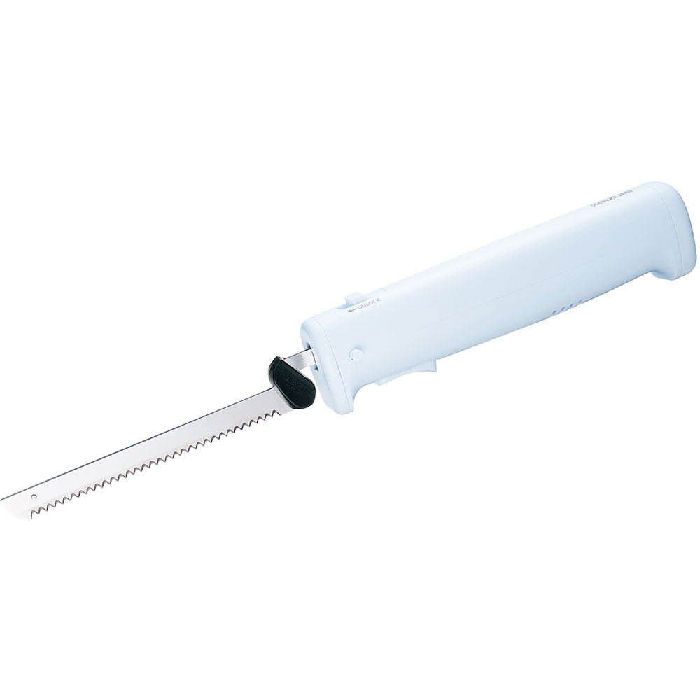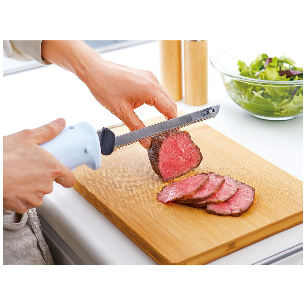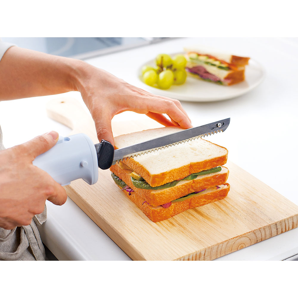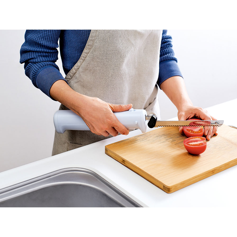 使い勝手のよい充電式、安全ロック機能付き、サビに強いステンレス刃。形がくずれにくくスムーズにカット、2枚の刃が交互にスライドして食材を潰さずカット。コードレスでカット時のストレス軽減。