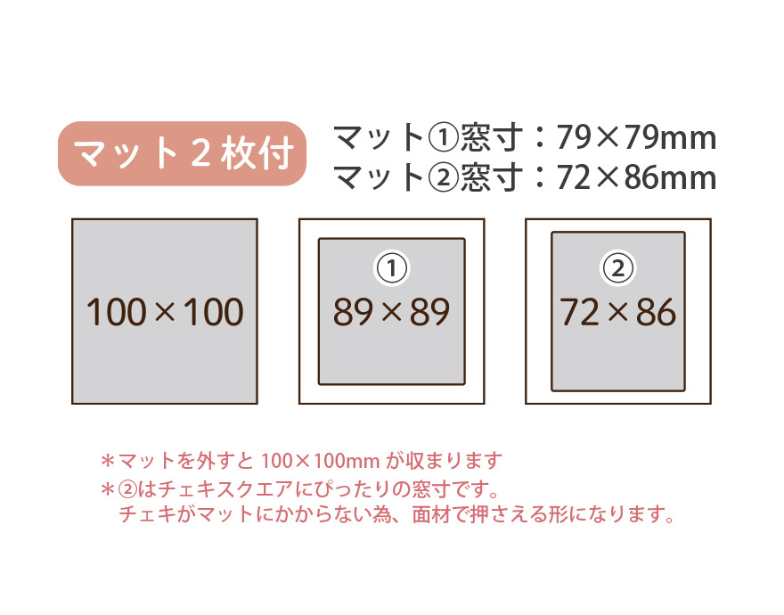 | 仕様1 | ■外寸:119×119×15mm■内寸:100×100mm■窓寸:93×93mm■重量:70g■柄:木目■本体:樹脂製■面材:樹脂■その他:壁掛用金具・縦横兼用スタンド付、マット2枚付 (89×89mm用窓寸) 79×79mm (チェキスクエア用窓寸) 72×86mm■注:(チェキ)は富士フィルム株式会社の登録商標です |