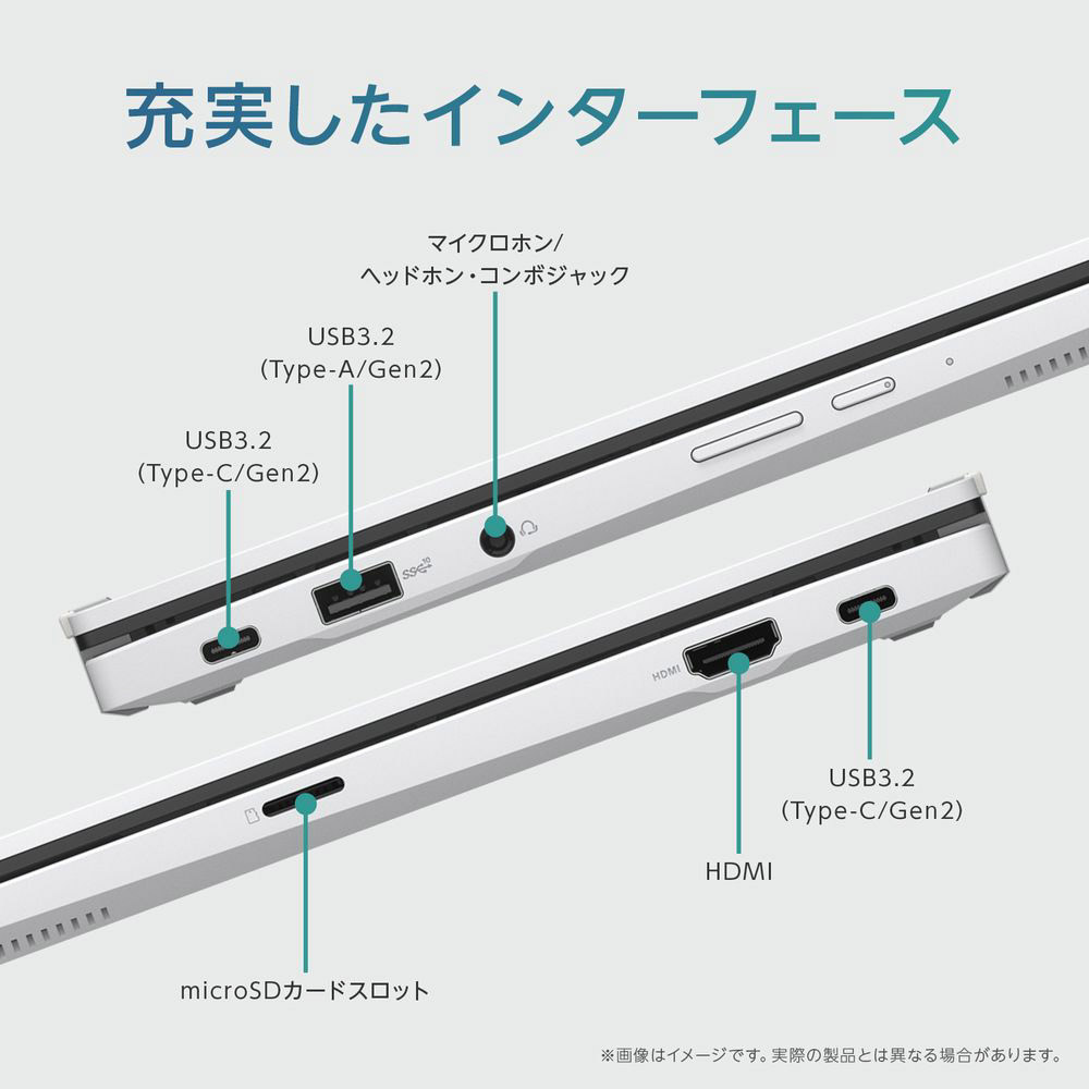 | インターフェイス | カードリーダー:microSDXCメモリーカード、microSDHCメモリーカード、microSDメモリーカード オーディオ:マイクロホン/ヘッドホン・コンボジャック×1(4極ミニプラグ) 外部ディスプレイ出力:HDMI×1 USBポート:USB3.2 (Type-C/Gen2) ※ ×2、USB3.2 (Type-A/Gen2)×1 ※データ転送と映像出力、本機への給電をサポートしています。すべてのデバイスの動作を保証するものではありません。 |