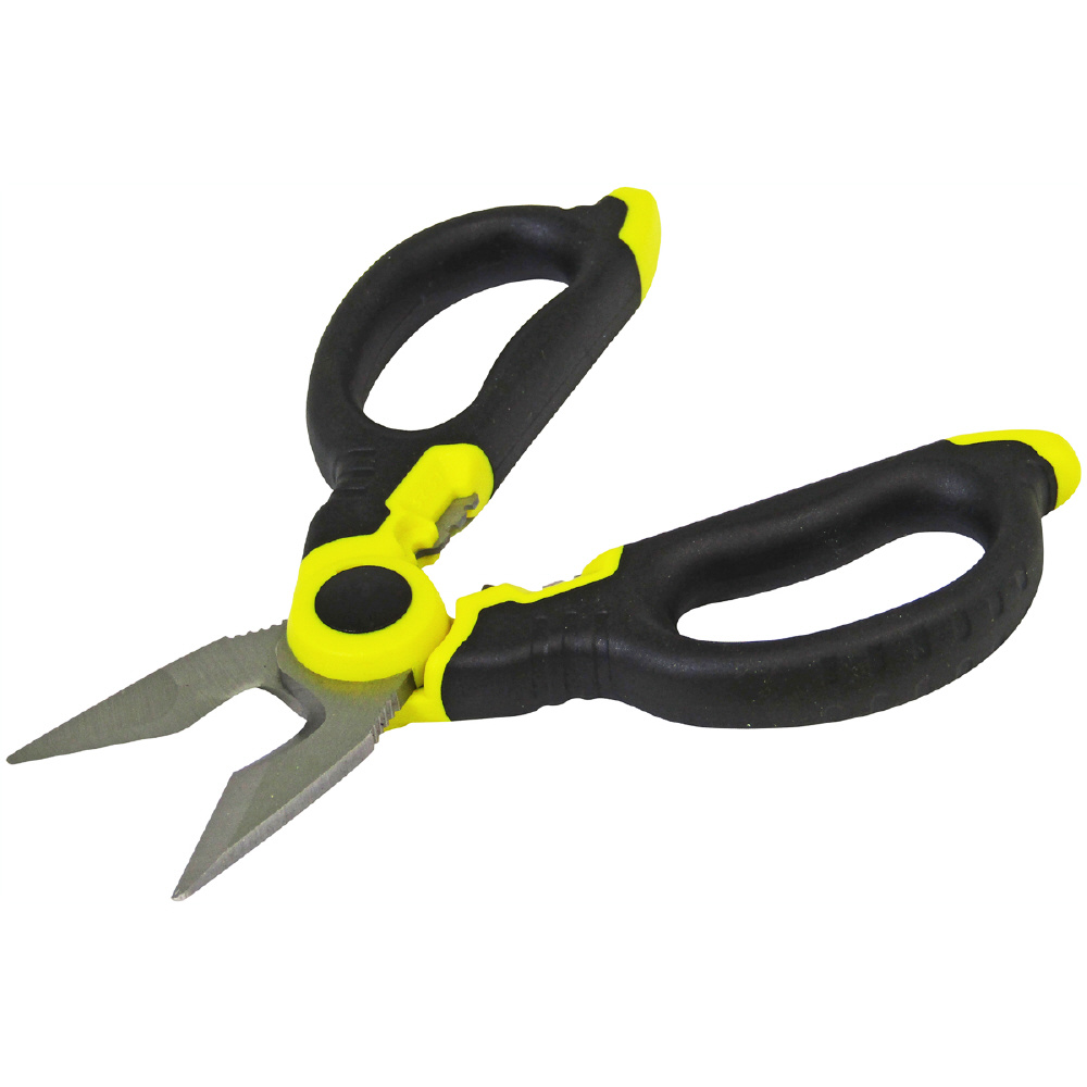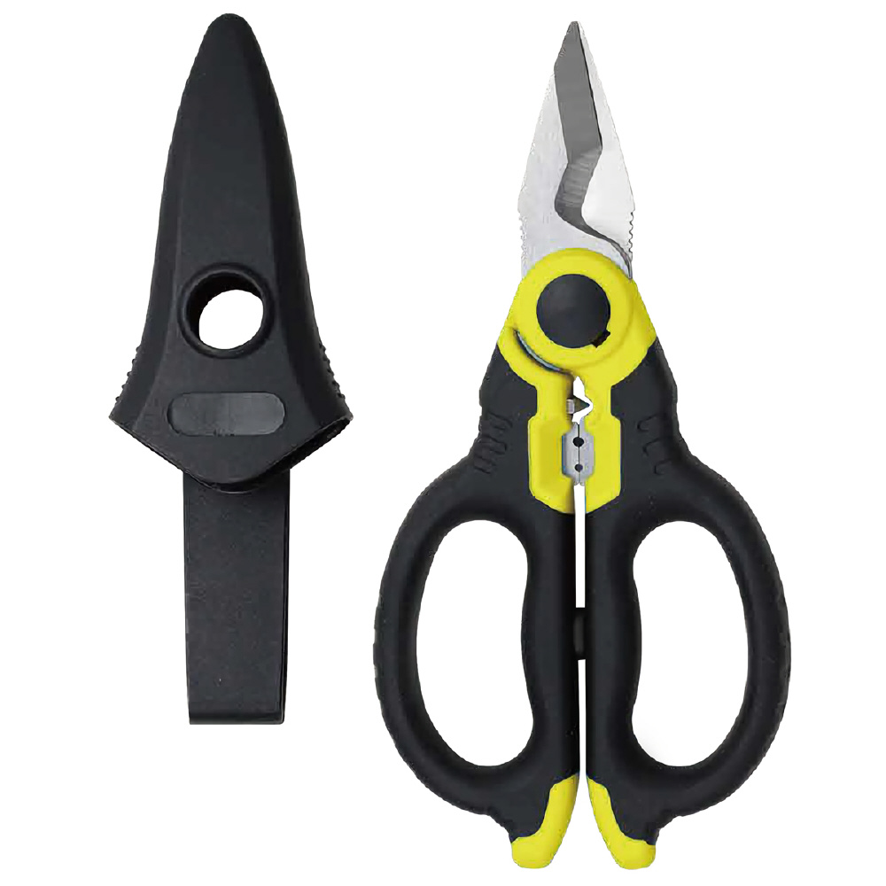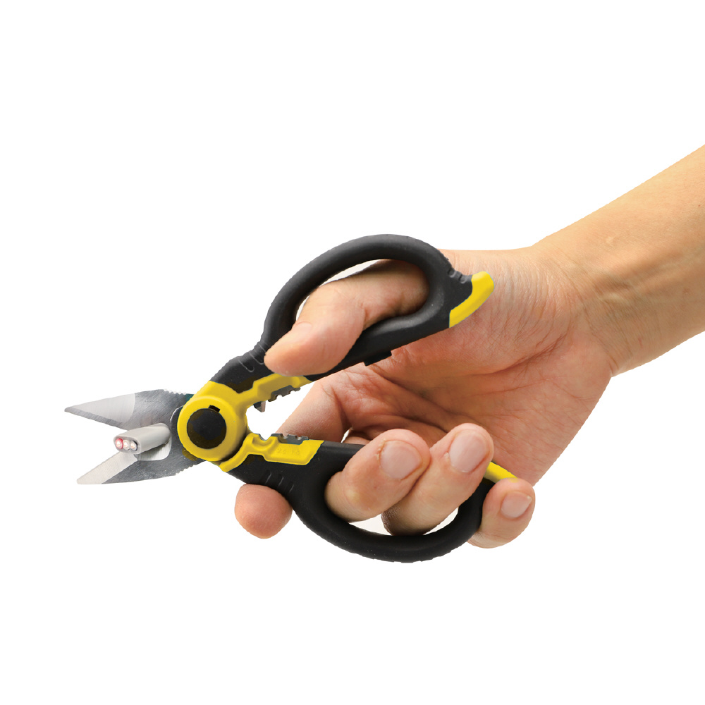 電工はさみマルチは硬度が高く耐久に優れたステンレスブレードを採用。サビにも強く永くお使い頂けます。さらに6つの機能でスムーズに作業をサポートします。VCT線やVVF線などを丸みのある刃で逃がさずにしっかり切断。高硬度かつ約3.7mmの極厚ブレードで強力に切断。サビにも強い。グリップに高耐久ステンレスブレードを内蔵成形。ハードな使用にも耐えるはさみです。