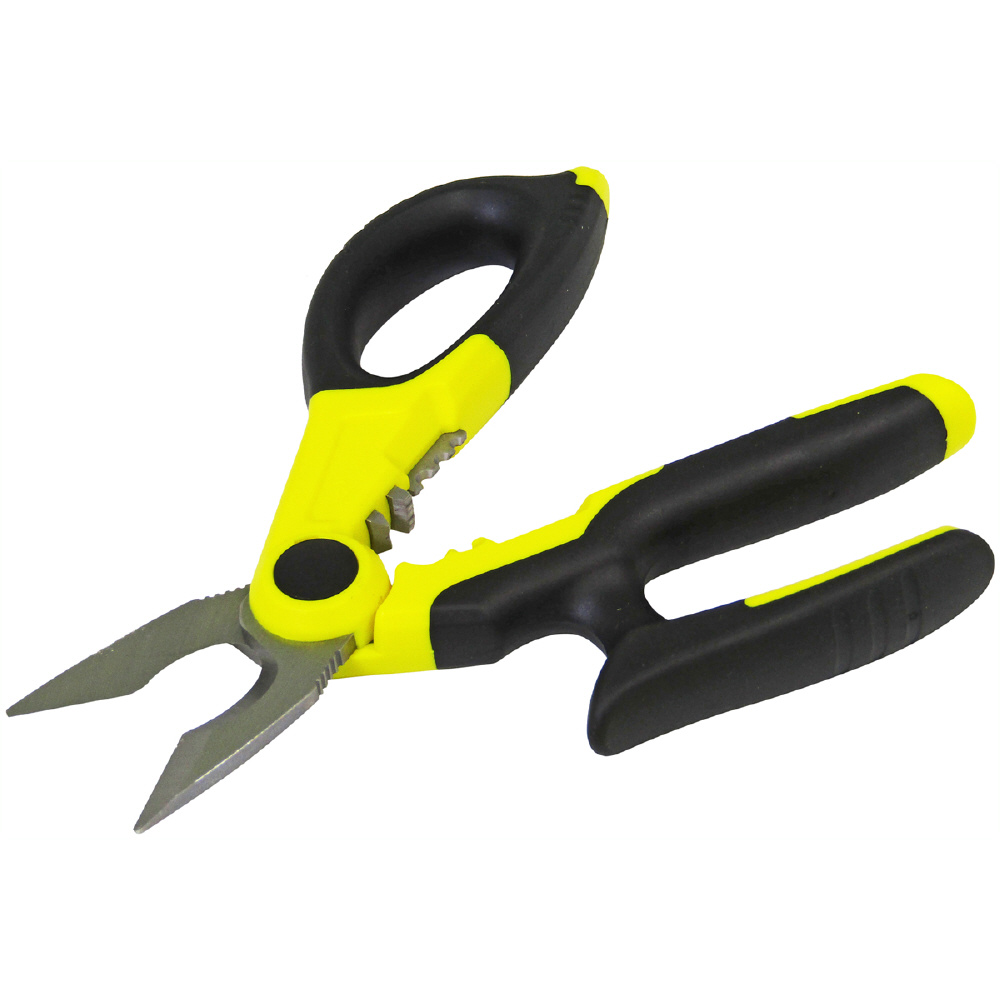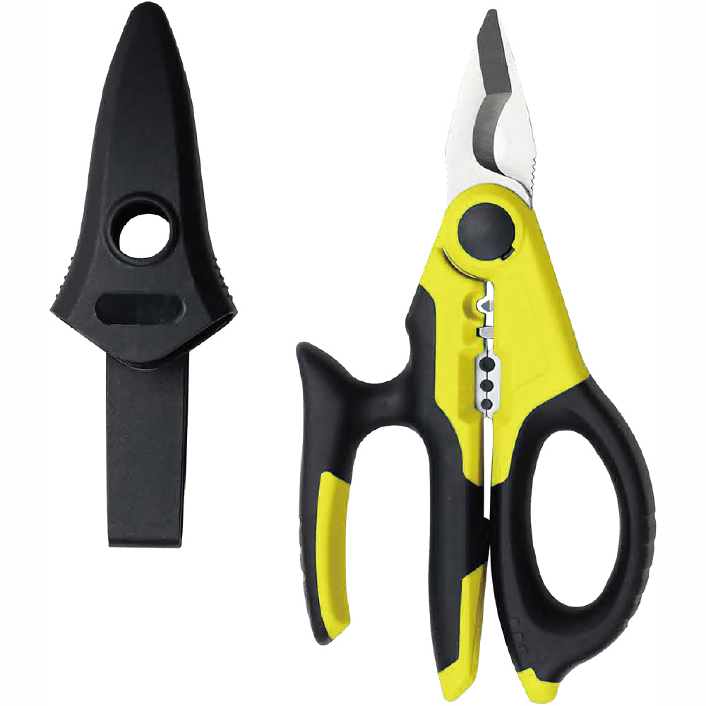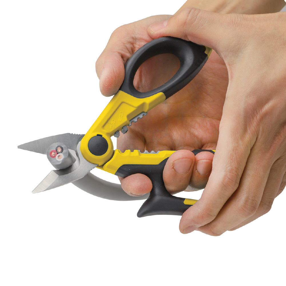 電工はさみマルチは硬度が高く耐久に優れたステンレスブレードを採用。サビにも強く永くお使い頂けます。さらに6つの機能でスムーズに作業をサポートします。VCT線やVVF線などを丸みのある刃で逃がさずにしっかり切断。高硬度かつ約3.7mmの極厚ブレードで強力に切断。サビにも強い。グリップに高耐久ステンレスブレードを内蔵成形。ハードな使用にも耐えるはさみです。