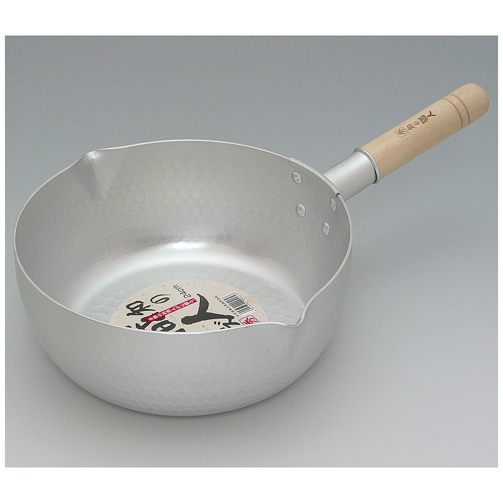 変形に強い厚板仕様の深型ゆきひら鍋。伝統の槌目加工で強度と耐久性に優れ、アルマイト加工で腐食しにくい。天然木を使用した持ち手は握りやすく、安全設計。ガス火専用。