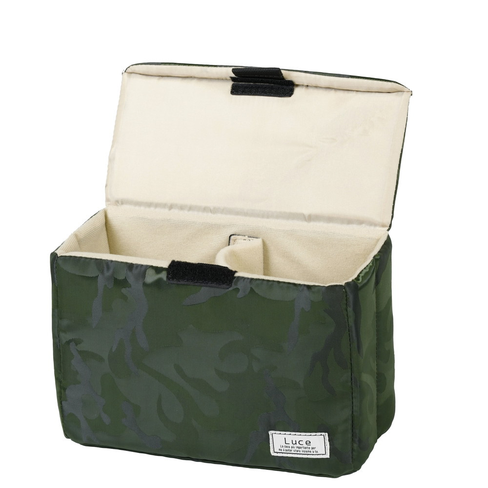 普段使いのバッグをカメラバッグにできるLuceインナーボックスに、人気のあるカモフラージュ柄が仲間入り。ジェンダーレスなカラーで、見えないオシャレを楽しみましょう。カラーはブラックカモフラージュ、グリーンカモフラージュ、グレージュカモフラージュの3色で、サイズはSサイズとMサイズをご用意。