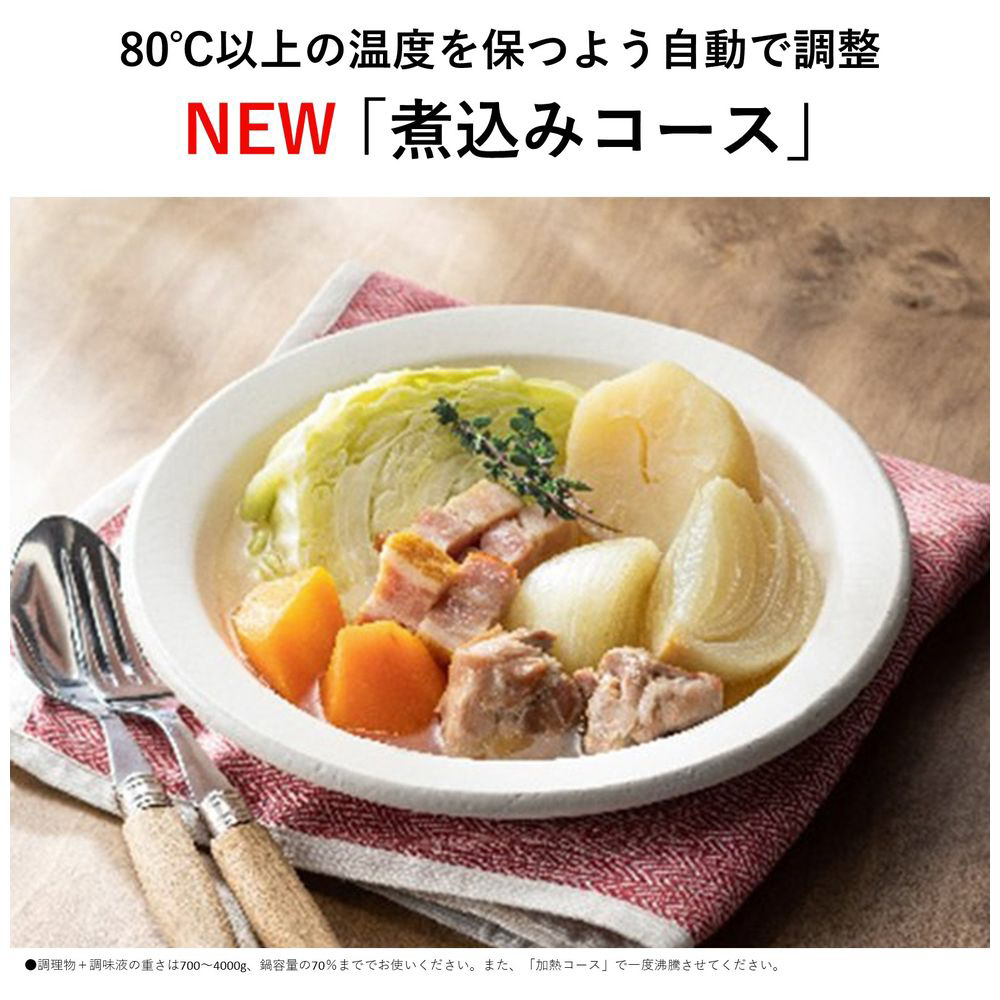 ※調理物+調味液の重さは700〜4000g、鍋容量の70%まででお使いください。また、「加熱コース」で一度沸騰させてください。