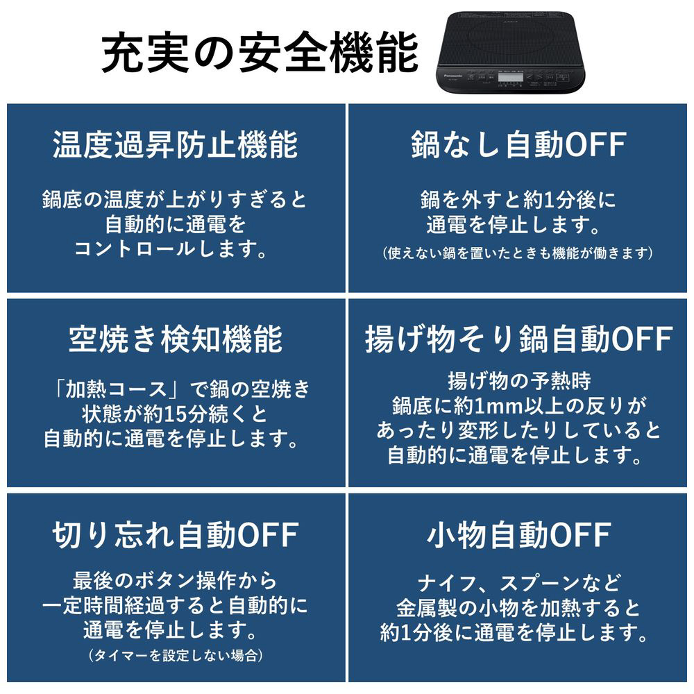 | 安全機能 | 温度過昇防止機能 空焼き検知機能 鍋なし自動OFF 小物自動OFF 切り忘れ自動OFF 揚げ物そり鍋自動OFF |