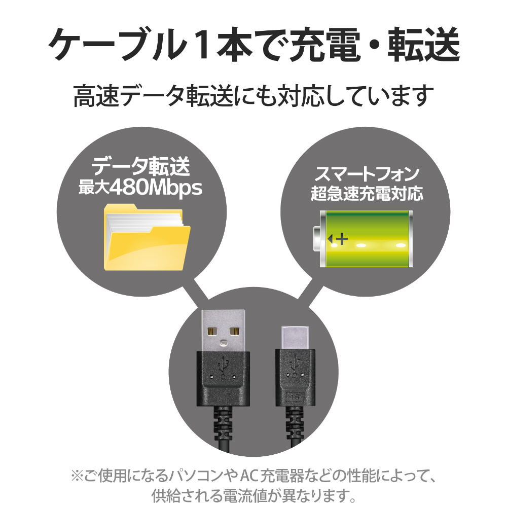 ■USB-Aを搭載しているパソコン及び充電器、モバイルバッテリーなどに、USB Type-C(TM)を搭載しているスマートフォンやタブレットを接続し、充電やデータ転送ができるUSB2.0ケーブルです。※USB Type-C and USB-C are trademarks of USB Implementers Forum