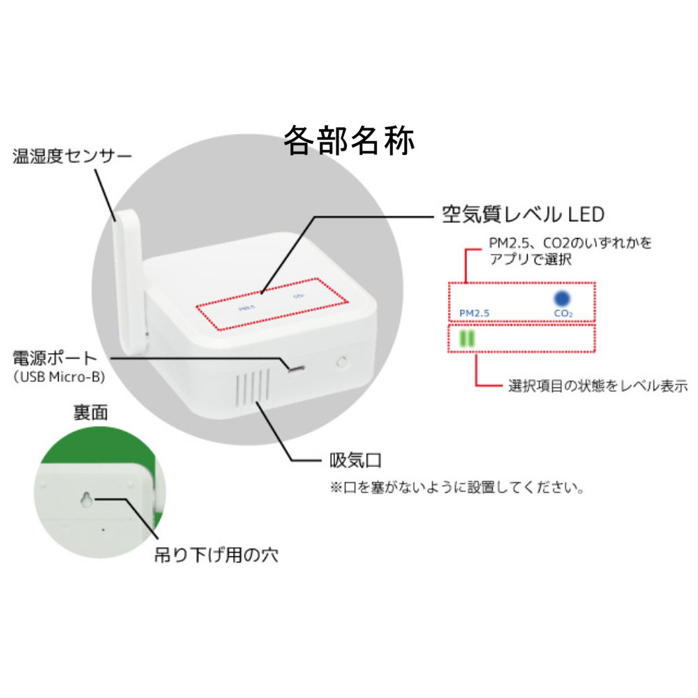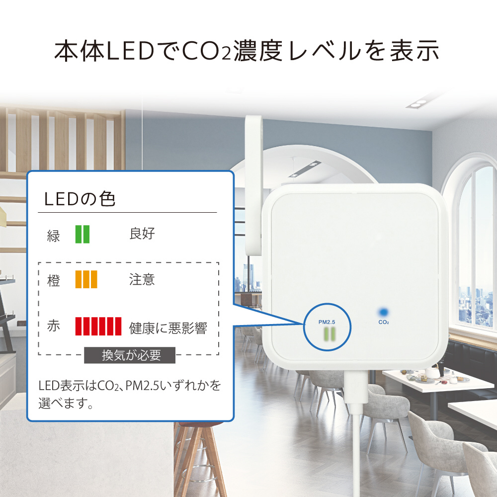●計測値の確認は、アプリ以外に、本体LEDでレベルを表示(CO2、PM2.5いずれか選択)その場で確認可能