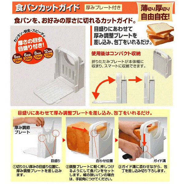 食パンをお好みの厚さに切れるカットガイドです。目盛りにあわせて厚み調整プレートを差し込み、包丁を入れるだけで薄切り厚切り自由自在。サンドイッチ用のパンなどハムやチーズにもお使い頂けます。