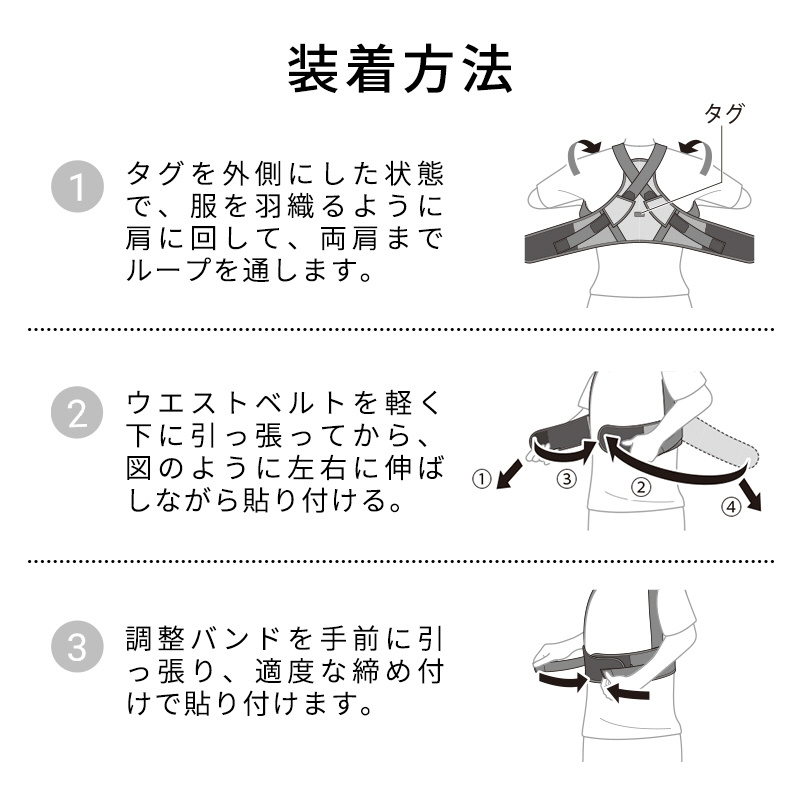 上タグを外側にした状態で、服を羽織るように肩に回して、両肩までループを通します。