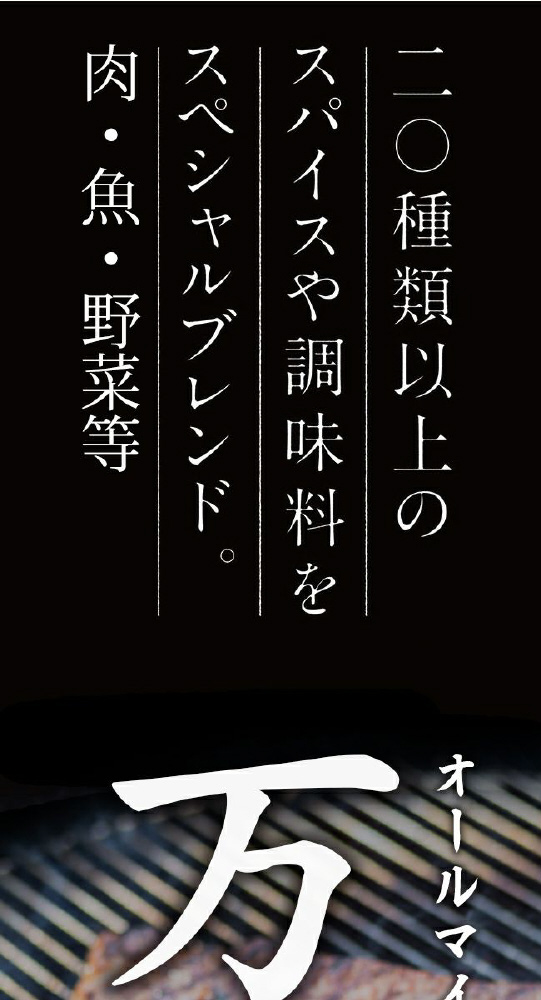 【原材料名】食塩、ガーリック、黒コショウ、粉末醤油、赤唐辛子、レッドベルペパー、陳皮、コリアンダー、ミルポアパウダー、植物油脂、チキン調味料、パセリ、パプリカ、オニオン、ジンジャー、バジル、オレガノ、マジョラム、ローズマリー、ローレル、セロリーシード/調味料(アミノ酸等)、リン酸Ca、(一部に小麦、大豆、鶏肉、豚肉を含む)