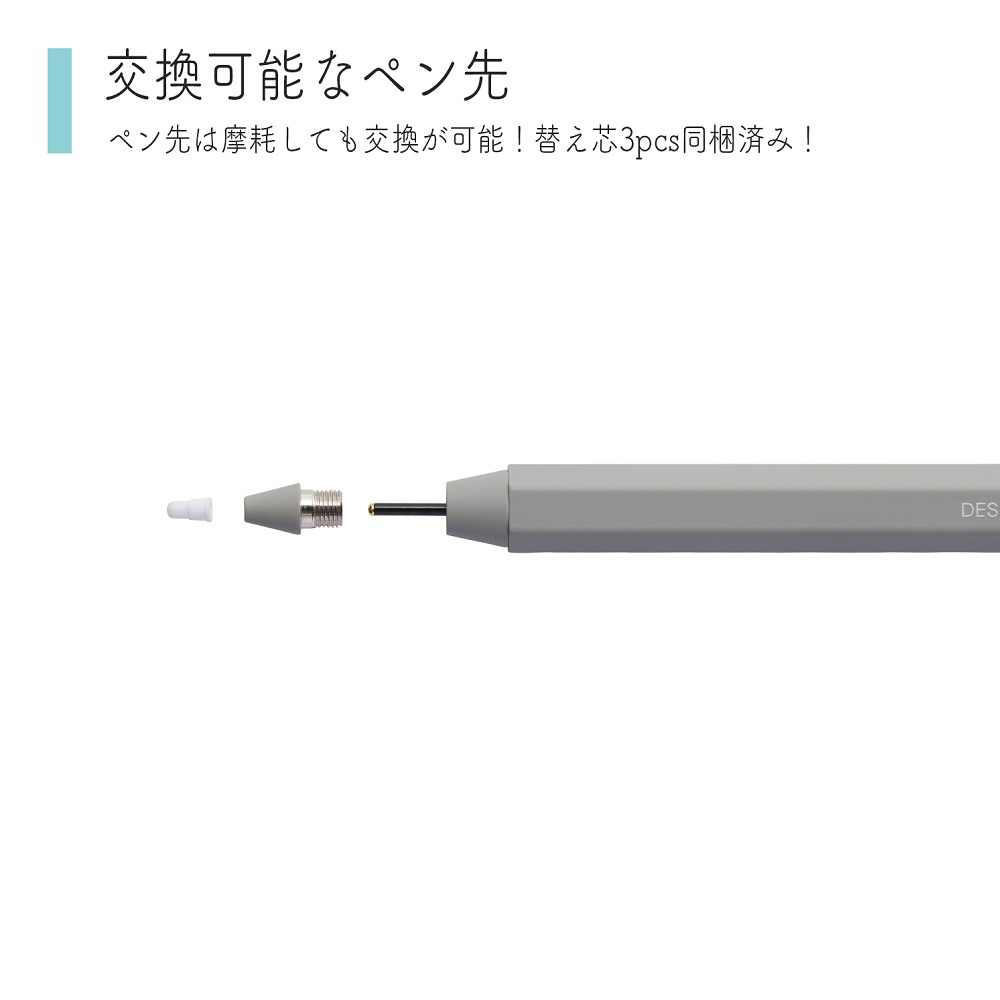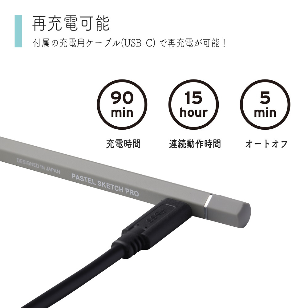 | 仕様2 | 外形寸法:直径約9 ( 先端部2.) × (H)165mm 質量:16g ペン先素材:シリコン 電源:内蔵リチウムイオン充電池 充電時間:約9分 連続動作時間:約15時間 オートオフ:約5分 パームリジェクション: 汎用モード× iPadモード〇 |