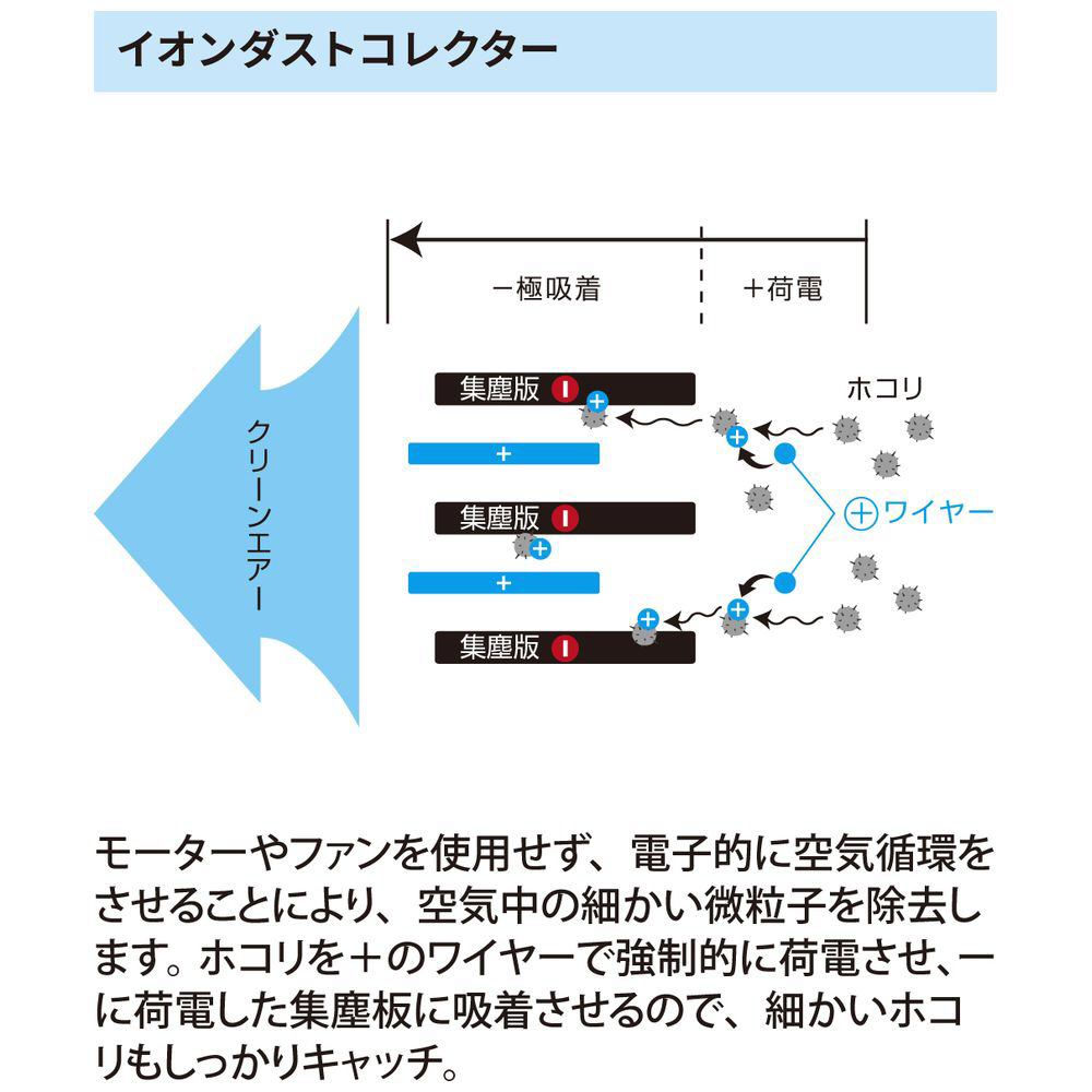 イオニックリトルは、電力の力で空気中の汚れを集塵する「イオンダストコレクター方式」を採用した小型空気清浄機です。モーターやファンを使用せず、電子的に空気循環させることにより、空気中の細かい微粒子を除去し、細かいホコリもしっかりキャッチ。微量のオゾンを発生させて、ニオイの元を分解。消臭効果も期待できます。また、微量のオゾンは、花粉対策やウイルス対策にも効果が期待できます。高さ25cmのコンパクトサイズでも、適用面積4.5畳の強力集塵を実現しました。