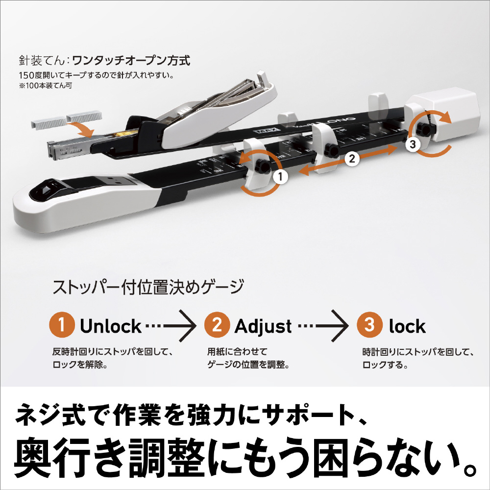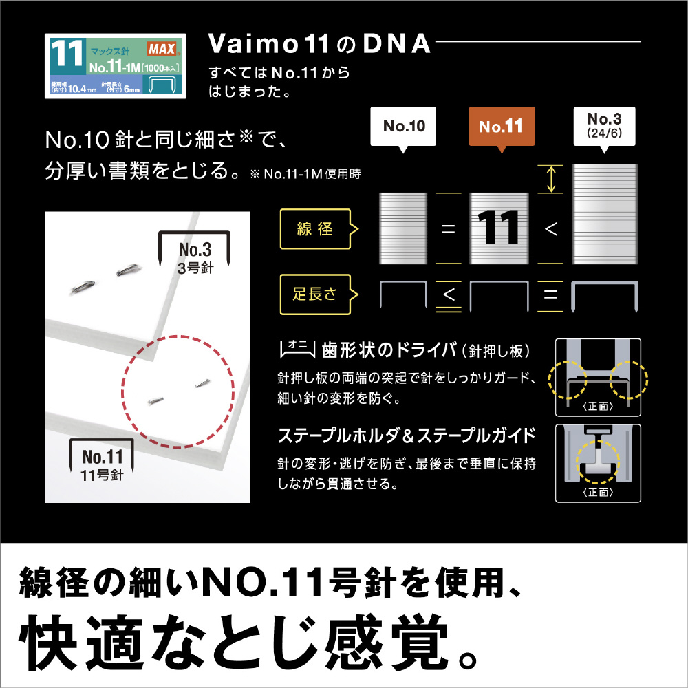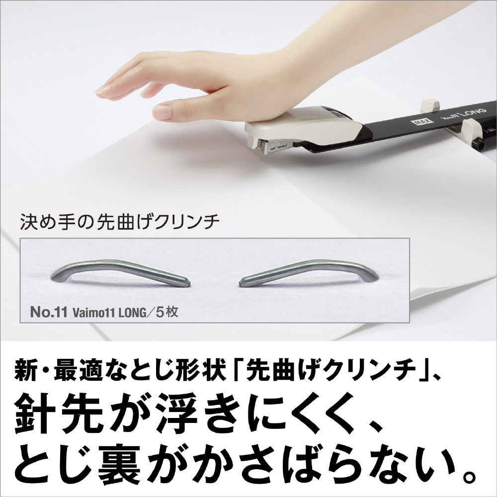 製本、冊子作りができます。とじ裏を平らにしつつ、針先が紙から浮かない「先曲げクリンチ」を採用。バイモの針を使用しており、線径の細さによる軽いとじ心地を実感できます。■中とじ可能サイズ:B5−A2 レターサイズも対応■中とじ可能ページ数:30枚まで(最大120ページの冊子を作成可能)■再生材使用率75%(グリーン購入法適合・分別廃棄可能)
