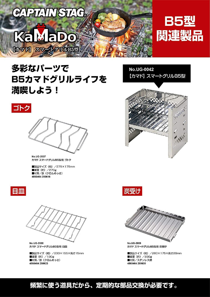 UG-42/カマドスマートグリルB5型3段調節交換用ゴトク。B5型関連商品。充実なアフターパーツ。多彩なパーツでB5カマドグリルライフを満喫しよう。頻繁に使う道具だから、定期的な部品交換が必要です。