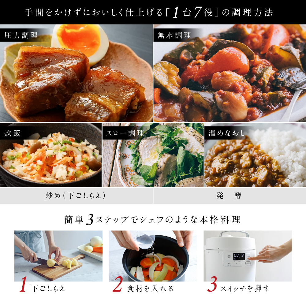 ■1台7役で便利(圧力、無水、炊飯、スロー調理、温め直し、炒め、発酵)