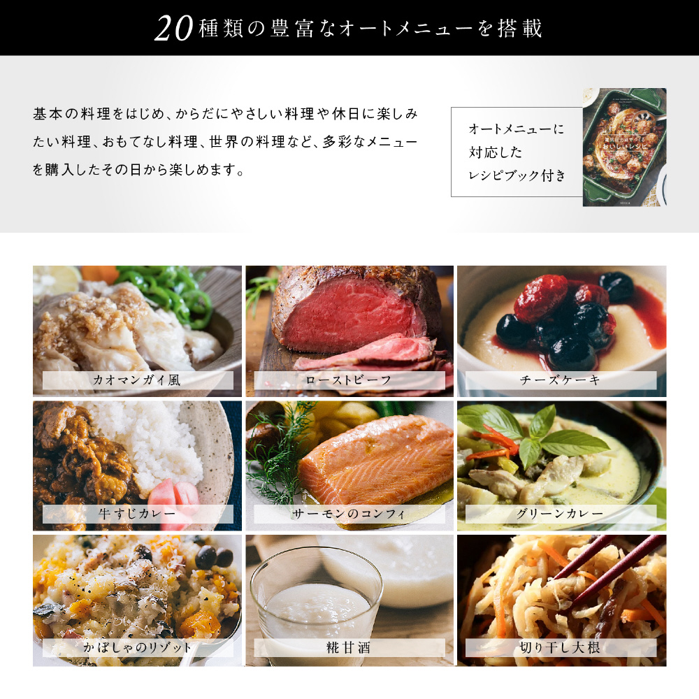 火を使わないから安心安全。いろいろな料理をおまかせで誰でも手軽に本格的に。「ほったらかし」なのにさらにおいしく。食材を入れてスイッチを押したら、あとは、むずかしい火加減もめんどうな時間計測も不要。ほうっておけるから、手が空き、時間が浮きます。
