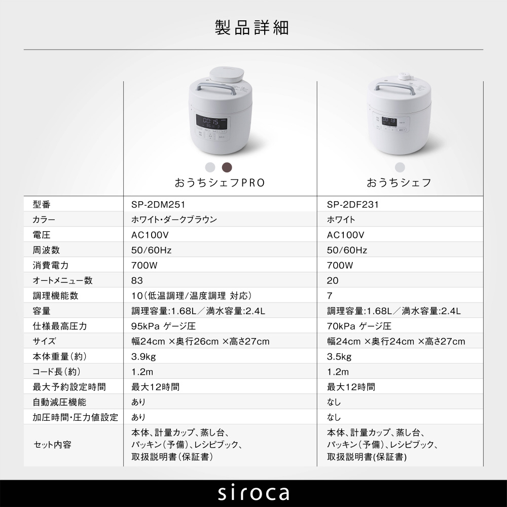 | 商品名 | 電気圧力鍋 おうちシェフ ホワイト SP-2DF231W 【864】 |