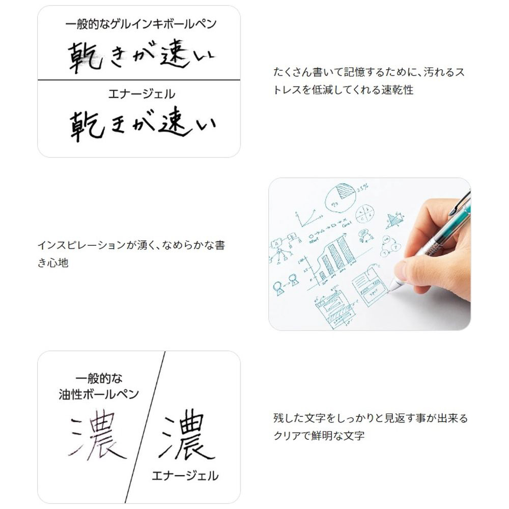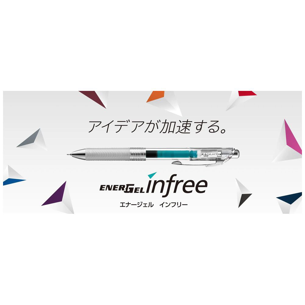 なめらかな書き味、鮮明な筆跡、速乾性が特長のエナージェルインキ採用。クリア軸から直感的にインキ色がわかるエナージェル インフリー。クリエイティブで自由なワークスタイルに相応しいアイデア表現ツールです。